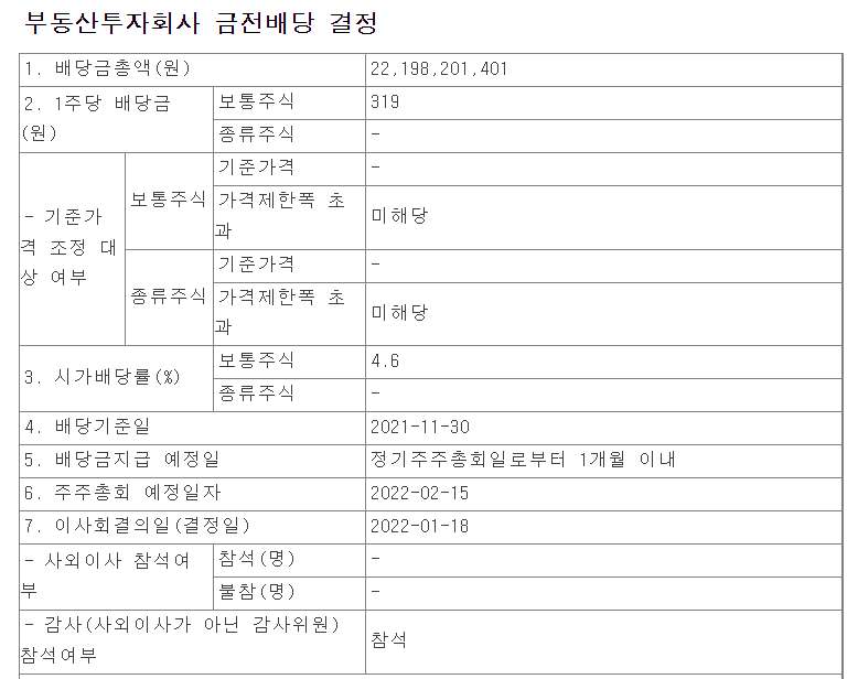 코람코에너지리츠가 2021년 하반기 반기 배당 공시를 했습니다. 배당 금액은 주당 319원이며 배당 기준일 기준 4.6% 시가배당률입니다. 또한 같은 날 약 500억 원 규모의 부동산 투자 공시도 함께 했습니다.