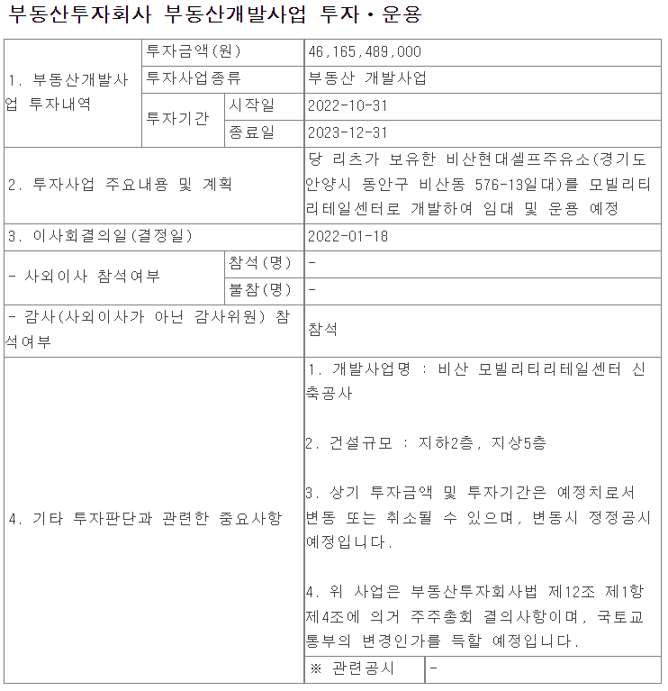 코람코에너지리츠는 수익성 낮은 지방의 자산을 매각하고 보유하고 있는 수도권 요지의 주유소를 복합 모빌리티물류센터로 리모델링하여 수익성 및 자산가치를 향상하겠다고 발표한 적이 있으며 그에 대한 일환으로 신세계 프로퍼티와 관련 협약을 맺고 계획을 진행 중이던 상태였습니다. 이번 공시를 통해 계획이 구체적으로 진행 중이다는 라는 사실을 확인한 셈이 될 것 같습니다.