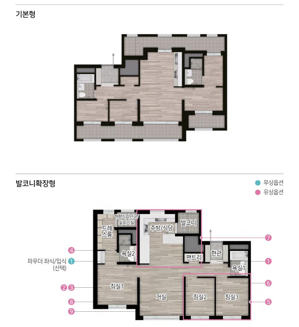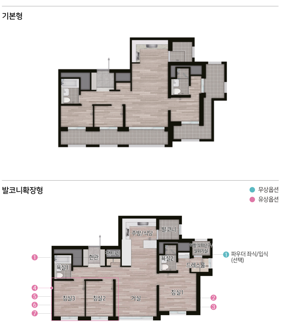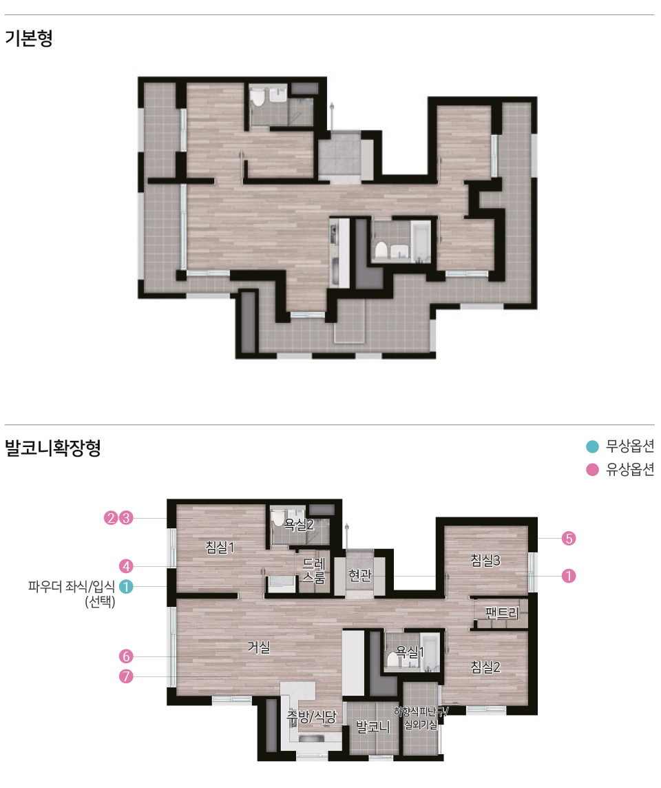 거실과 안방이 전면을 향하고 침실 2,3이 뒤로 빠진 타워형 구조로 3면 발코니 확장을 통한 서비스 면적 극대화를 적용한 구조입니다. 일반 타워형 구조가 침실 2,3이 나란히 있는 반면 서로 마주 보게 구성한 좀처럼 보기 힘든 특이한 구성입니다.