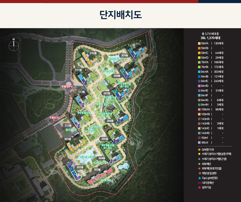 전체 1370세대 중에서 59A Type 130 세대, 59C Type 44세대, 59D Type 29 세대, 76A Type 166 세대, 76B Type 172 세대입니다. 59B Type은 3 BLOCK에 없습니다.