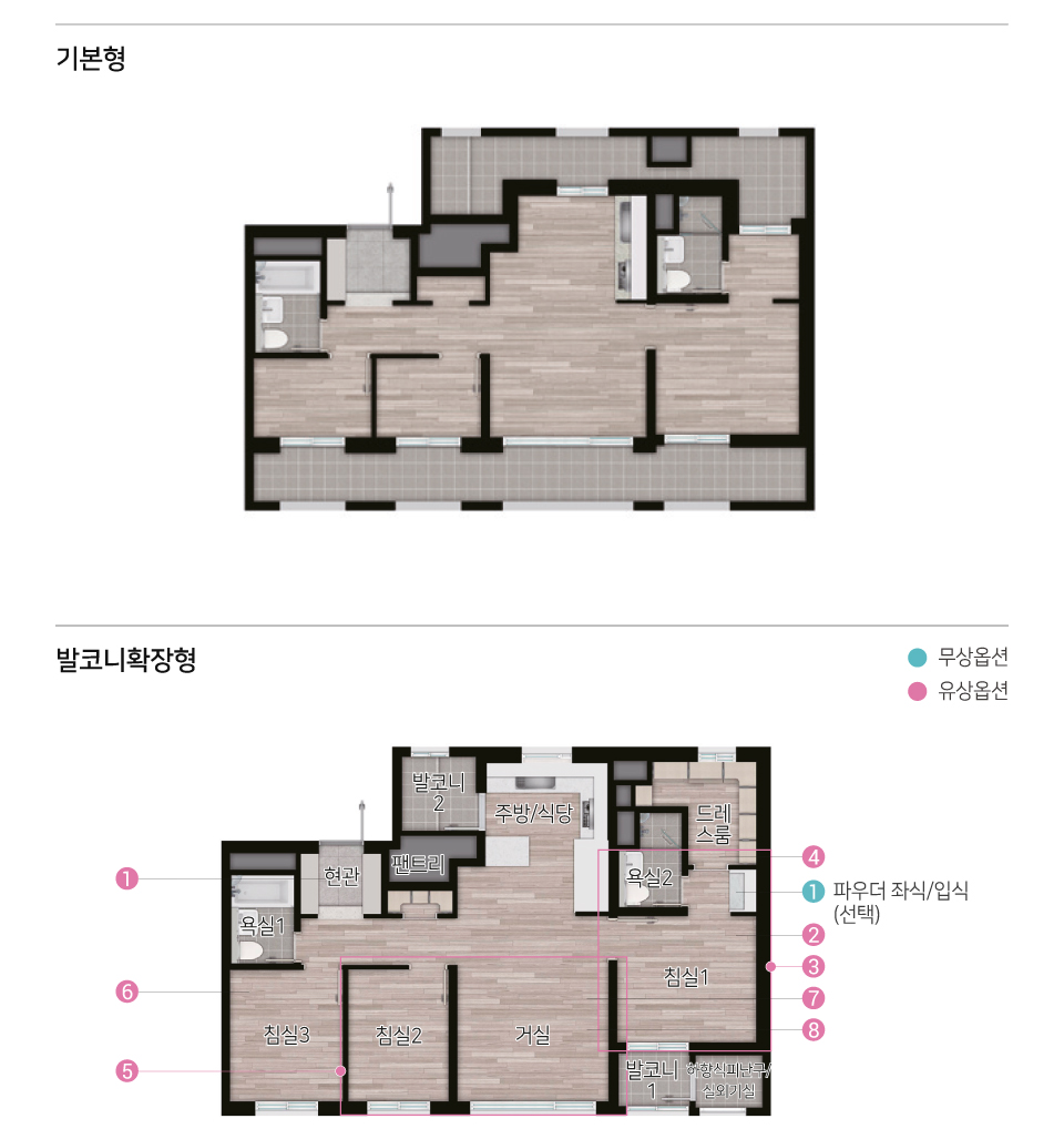 3면 발코니 장점을 십분 발휘하여 타워형에서는 좀처럼 보기 힘든 알파룸을 제공하지만 살짝 사이즈가 작습니다. 알파룸과 침실 2의 벽을 없애고 문을 욕실 쪽으로 연결하면 침실 2 공간이 엄청 늘어나는데 활용성 측면에서 어떨지 궁금합니다.