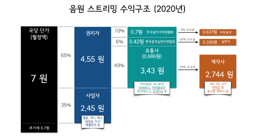 위와 같이 5년간 다운로드를 제외하고 스트리밍 횟수만 28억 회로 1년에 약 5.6억 회를 기록하고 있다. 이는 최근 5년에 새로 발표한 신곡 기준이며 아이유는 십 년 전 발표하여 올해 역 주행한 '내 손을 잡아' 등 이전 발표곡의 스트리밍 누적치도 상당하여 대충 계산하면 연 6억 스트리밍 정도가 된다. 국내 음원시장의 수익배분은 일반적으로 아래와 같이 알려져 있다.
