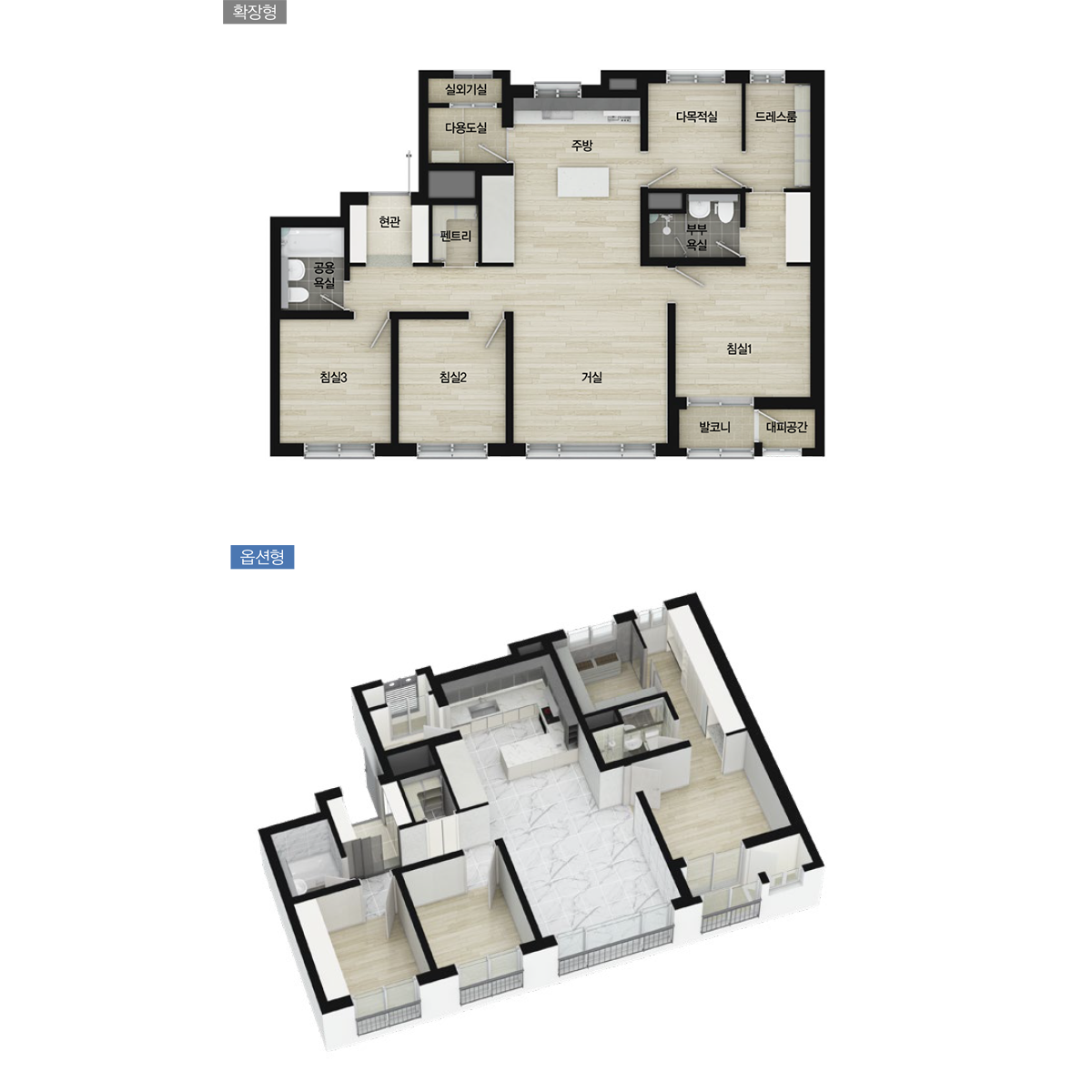 드레스룸의 구조로 인해 76A Type과 달리 드레스룸과 다목적실과 합치는 것은 불가능 하지만 다목적 실 그 자체만으로 사이즈가 넉넉하여 공간 활용에 여유가 있습니다.