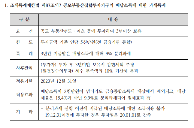 조세특례제한법 제87조의 7 공모 부동산 집합투자기구의 지분증권 또는 수익증권에 투자하는 경우 3년 이내에 지급받는 배당소득에 대해 종합소득 과세표준에 합산하지 않고 9%의 세율을 적용. 이때 지방소득세 포함 9.9%이며 농어촌특별세는 부과하지 않습니다.