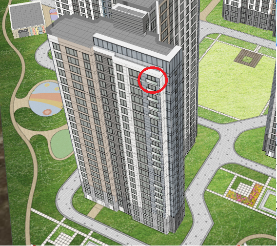 세대 구성은 4 베이 판상형과 타워형 구조를 보이고 있으며 특히 전면동 판상형 일부 세대는 아래 조감도에서 빨갛게 표시한 부분을 보듯이 바다 조망을 위한 오픈 발코니가 적용된 세대임을 확인할 수 있습니다.