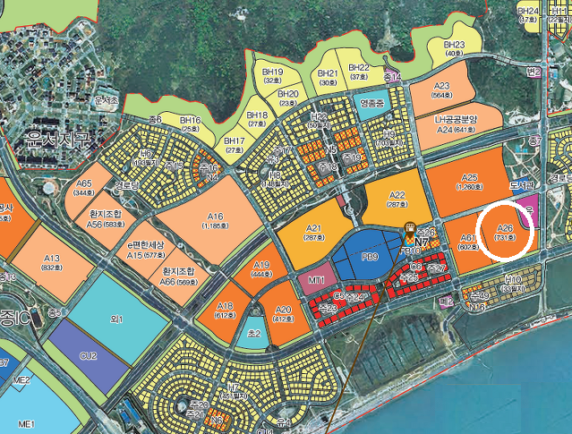 최근에 분양을 마친 바로 A26블록 바로 뒤편에 있는 A25블록 대성베르힐이 면적이 72,301m 2에 토지 가격이 136,648,000,000원으로 평당 6,247,936원이며 A26은 면적이 42,347m 2에 토지 가격 92,739,930,000원으로 평당 7,239,669 수준입니다. 약 20% 정도 바다조망 프리미엄이 들어간 것으로 보입니다. (그렇다고 분양가가 바로 20% 뛰는 건 아니고 토지 가격차이가 그렇다는 말입니다.)