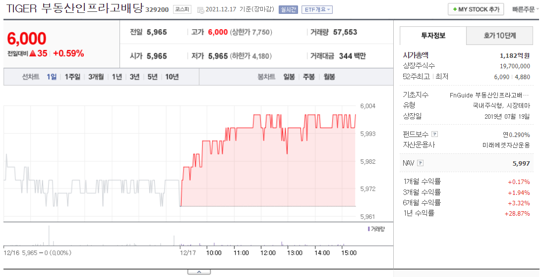 퇴직연금DC 계좌에서 투자했던 TIGER 부동산고배당인프라 ETF가 리츠ETF 특화를 위한 포트폴리오 변경을 발표했다. 4800원 대에 매수하여 배당받고 5600원대에 수익실현과 수수료등의 이유로 리츠직접투자를 하기로 하여 매도하였는데 그후로도 계속 우상향한 ETF이다.