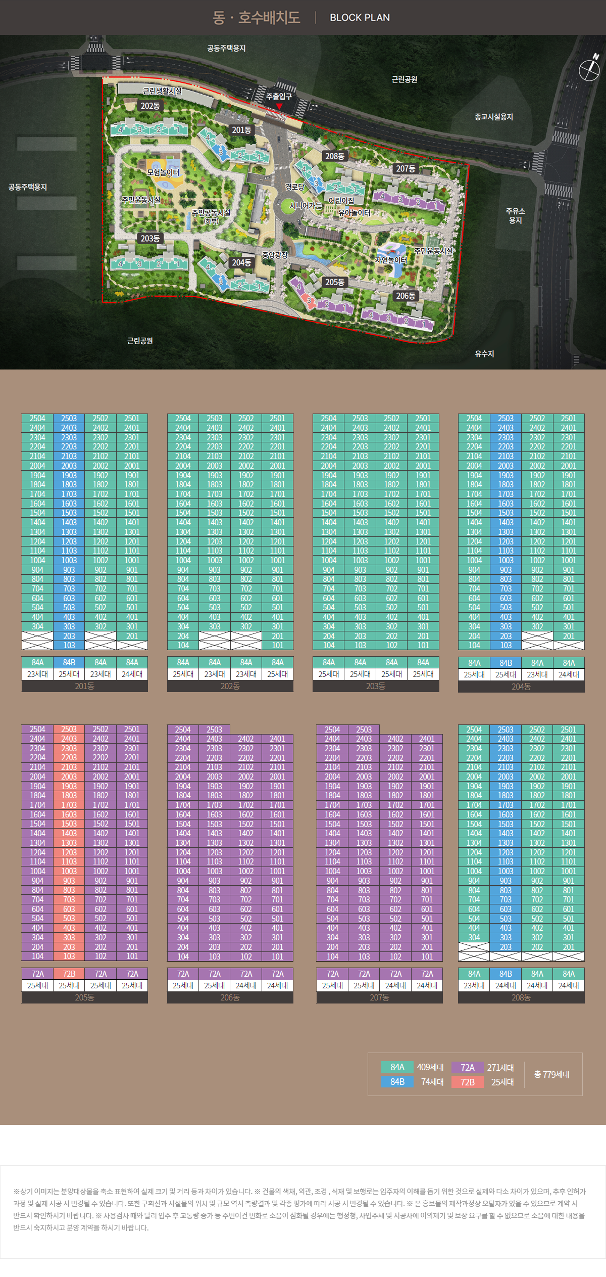 74A Type 271세대, 74B Type 25세대, 84A Type 409 세대, 84B Type 74세대 전체 779세대의 중형 단지입니다.