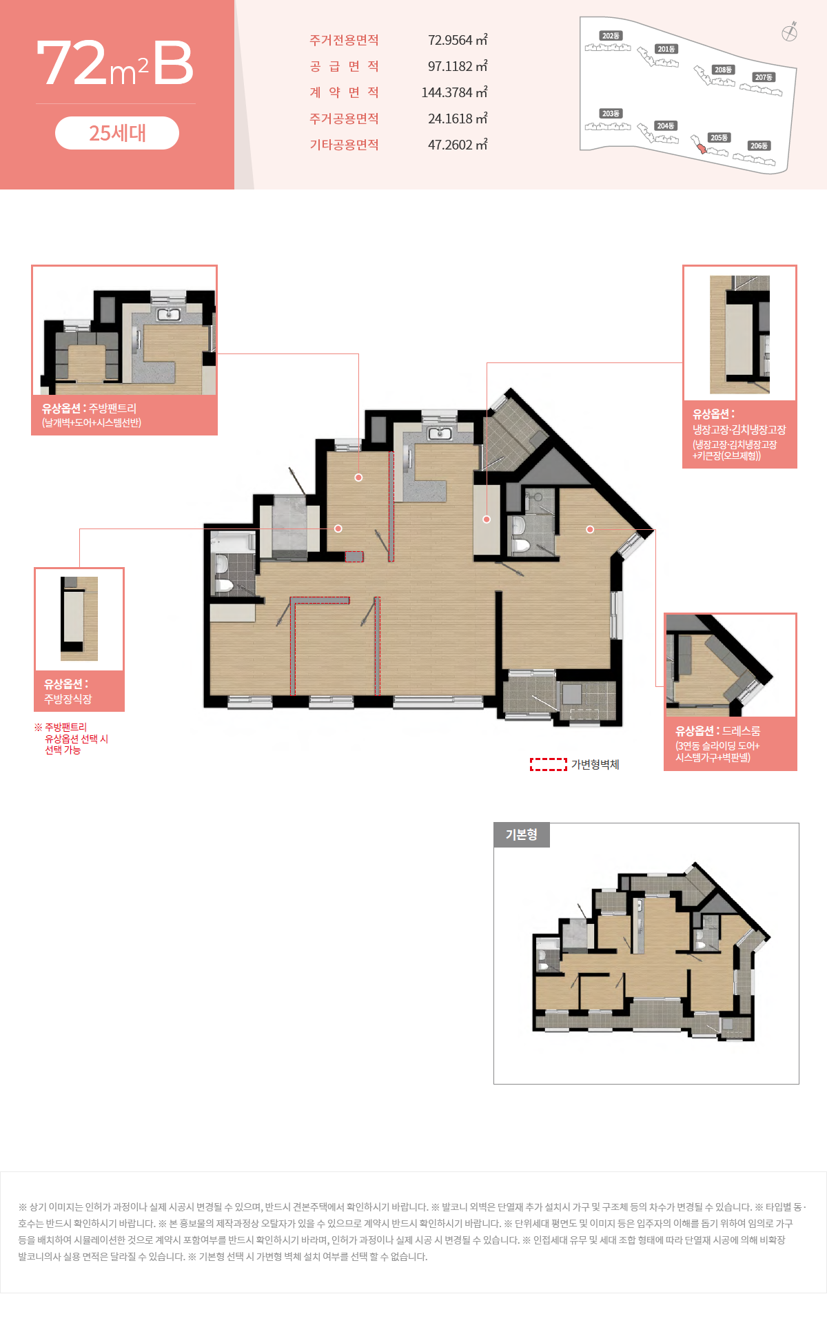 전용면적 72m2에 알파룸을 넣어준 것은 아주 좋은데 - 사실 아주 대단합니다. - 원래 전용면적이 한계가 있다 보니 알파룸 공간이 길이는 잘 나왔지만 폭이 짧아서 침실 공간을 대체하기에는 역부족으로 보이며 덩달아 알파룸 때문에 주방 공간이 작아졌습니다. 꼭 침실 4개 필요하다면 모를까 그게 아니라면 주방 유상 옵션을 선택해 팬트리 공간과 주방 전면을 확 트이도록 보이는 게 더 좋아 보입니다. 개인적으로 72m 2에서 침실 4개는 무리하고 생각합니다. 알파룸을 넣다 보니 보도 팬트리 혹은 주방 팬트리가 등의 수납공간영역을 확보하지 못했습니다.