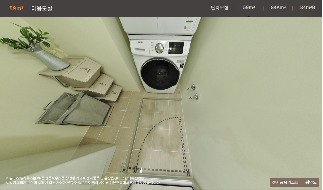 공용욕실은 욕조와 세면대 그리고 변기 사이사이의 공간이 너무 없어 보입니다. 소형평형의 한계일 수 있지만 다소 답답해 보이며 공간의 여유가 아쉽습니다. 또한 청소를 용이하게 하기 위한 변기에 스프레이 건이 없어 아쉽습니다. 세탁실도 다소 사이즈가 아쉬우나 활용성에서 별 무리가 없겠습니다.