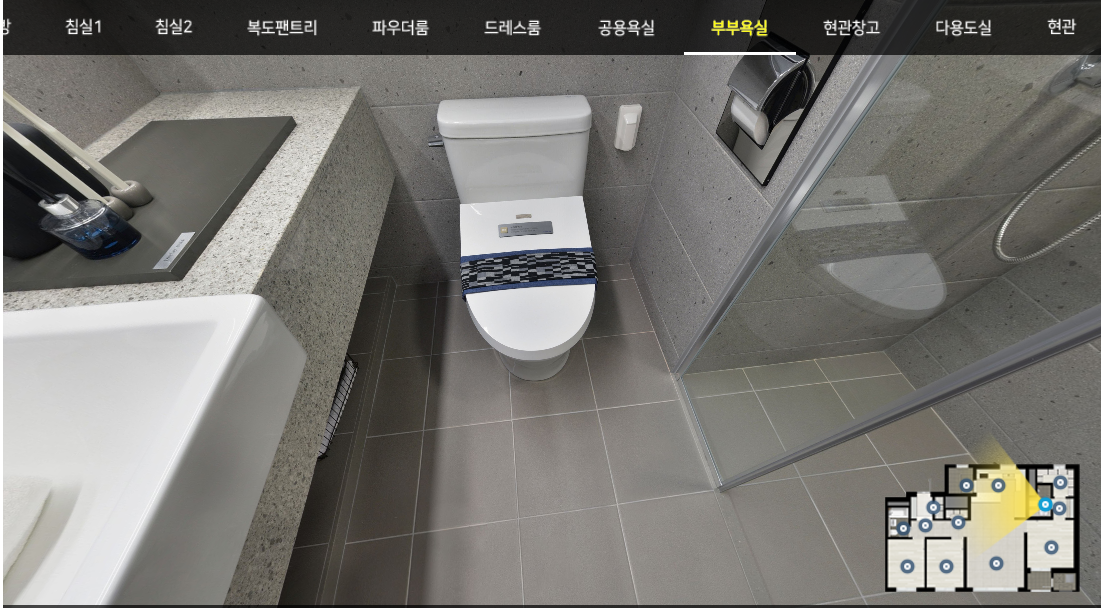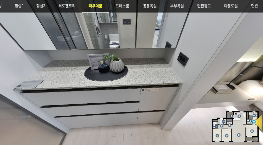 안방 파우더룸은 아래와 같이 입식입니다. 공용욕실은 세면대 구조가 특이한데 사용성은 어떨지 모르겠습니다.