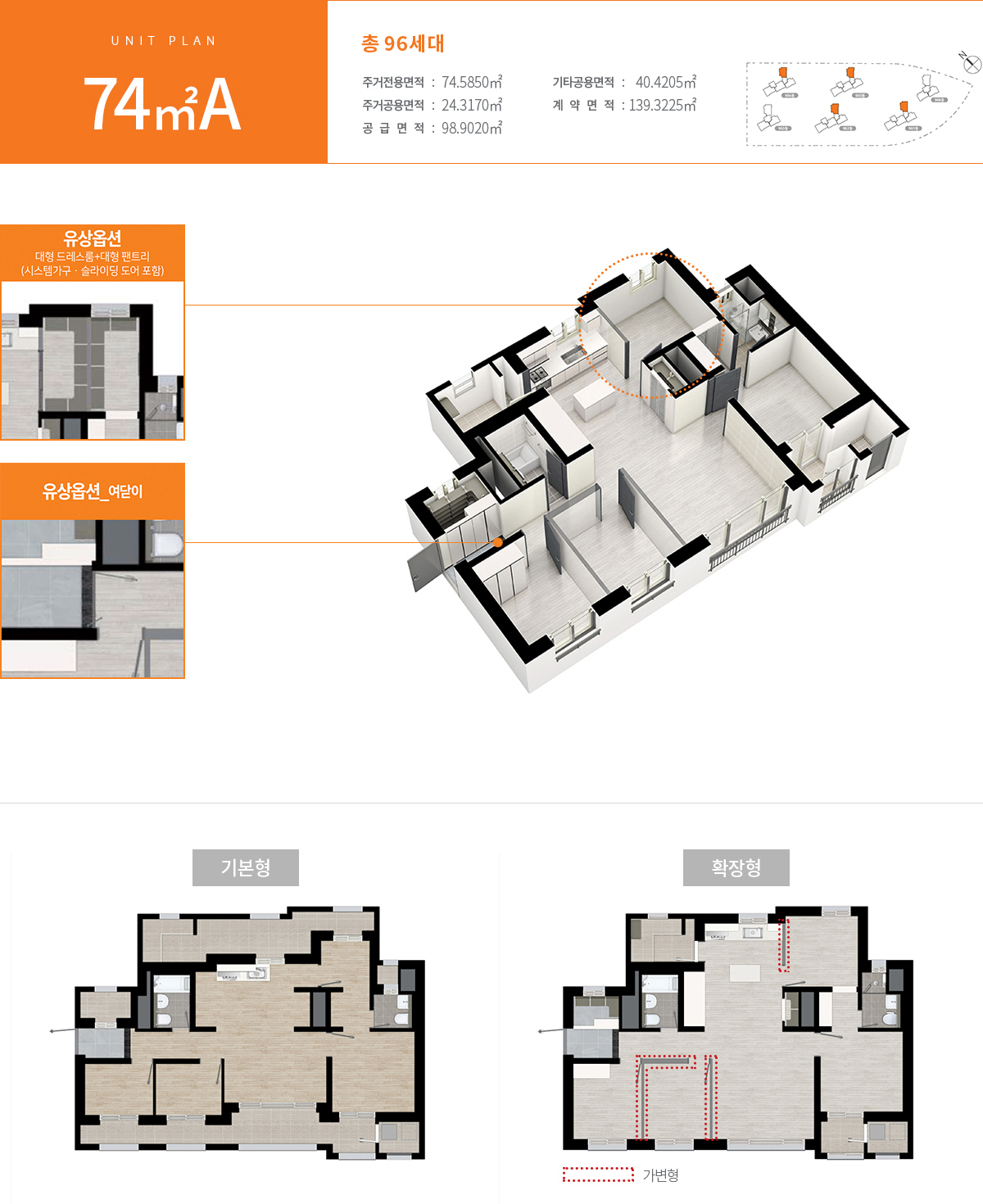 74A Type 96세대, 74B Type 98세대, 84A Type 117세대, 84B Type 123세대, 84C Type 50세대 , 84D Type 50세대로 구성되었습니다.