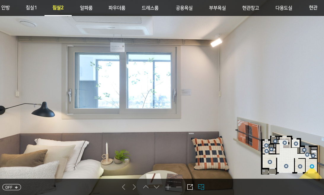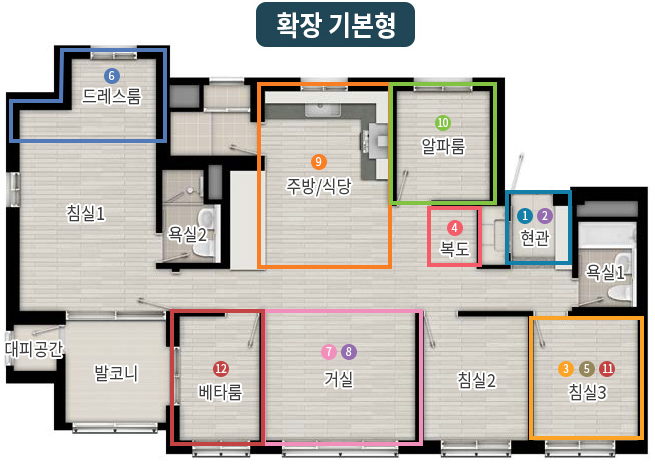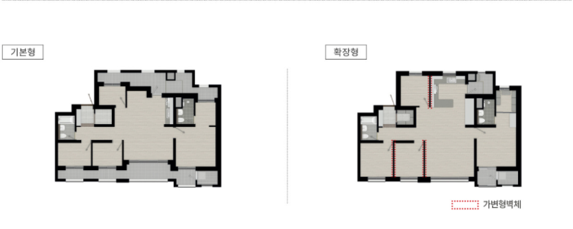 - 거실과 침실 2,3을 가벽으로 구성해 선택에 따라 광폭 거실, 광폭 침실을 만들 수 있는 구조
