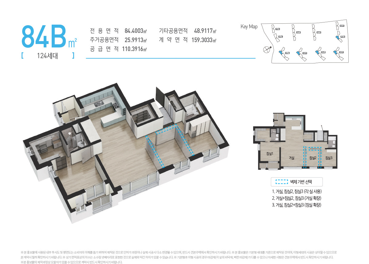 - 4 Bay 평면에서 거실 및 침실 2, 침실 3 벽체를 가변벽체로 적용하여 원하는 스타일로 선택할 수 있어 공간 활용성이 높습니다.