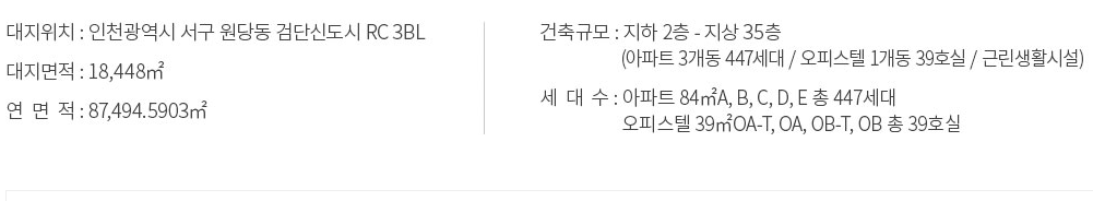 지하 2층 지상 35층 전용면적 84m2 단일 면적 세대로 구성되는 총 446세대 중소형 단지입니다. 오피스텔이 별도로 39호실이 같이 건립되며 용적률과 건폐율은 주상복합인 관계로 높습니다. 주차대수는 1.22로 평형대 대비 조금 작은 편입니다.
