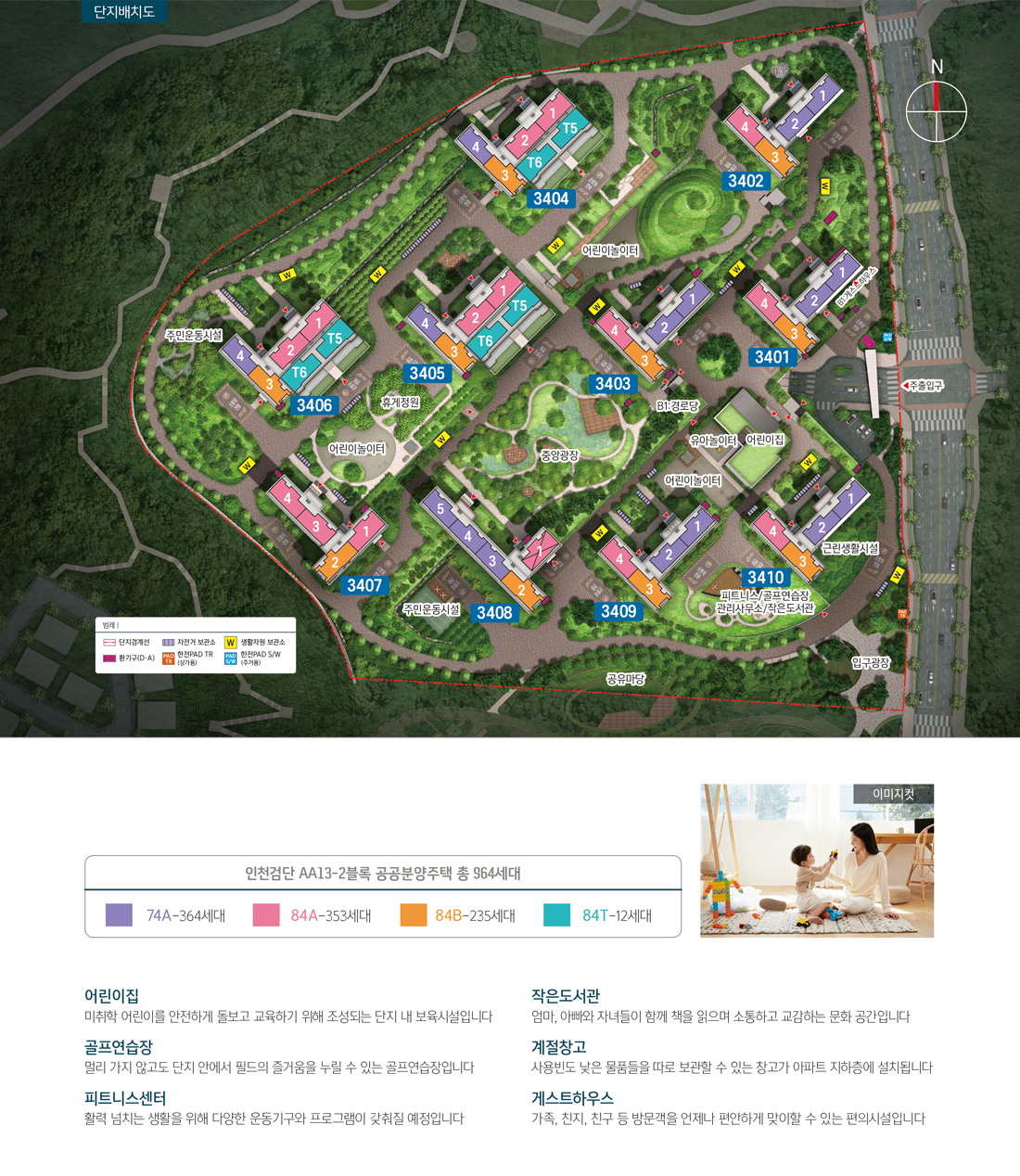 중소형 위주 LH 공공분양으로 커뮤니티 특화 측면에서 추가된 시설은 없으며 일반적인 어린이집, 경로당, 작은 도서관, 피트니스센터 등 일반적인 커뮤니티 시설을 제공하며 게스트하우스와 지하층에 세대별 개인 창고를 제공하는 것이 특징입니다.