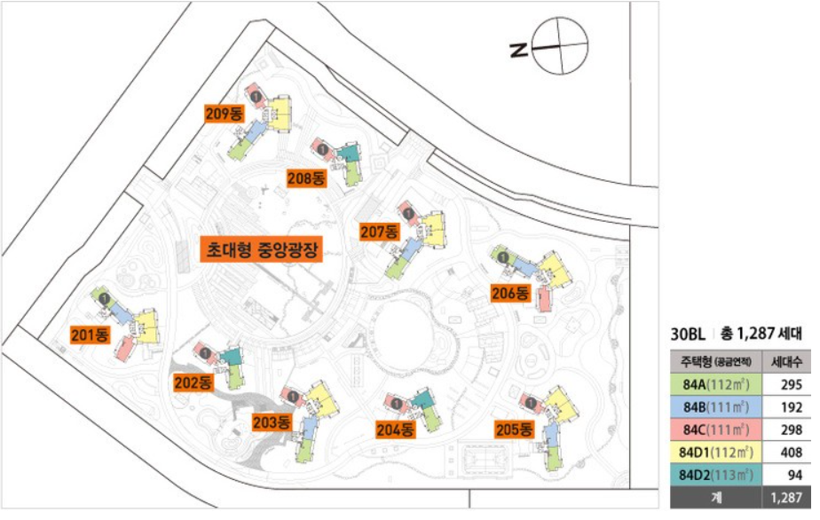 총 9개동으로 구성되었으며 동 간 거리가 넉넉하고 아파트 중앙의 대형광장을 둘러싼 단지 배치로 개방감이 뛰어나고 동 간 간섭이 적어 일조권에 침해받는 저층이 적습니다. 아래 그림에서 동 표기가 200번대로 표기되었는데 하늘도시 단지 명칭에 의거 200번대가 750번대로 변경되었습니다. 전면 동인 205,206 (755,756) 동의 경우 송산을 정면으로 보고 있으며 20층 이상의 경우 송산 너머로 영구적인 바다조망이 가능합니다. 현재 전면동 앞에 20층 규모의 동원로얄듀크 아파트가 공사 중에 있어 일부 중간층의 경우 조망을 가리게 됩니다. 전면동 25층 이상의 경우 하늘도시에 몇 안되는 영구적인 바다조망을 갖는 아파트가 됩니다. 하늘도시에는 현재로서는 바다조망이 가능한 아파트가 꽤 되나 개발 계획상 주상복합부지의 건물이나 특별계획구역의 건물이 들어서면 대 다수의 아파트가 바다조망을 잃게 됩니다.