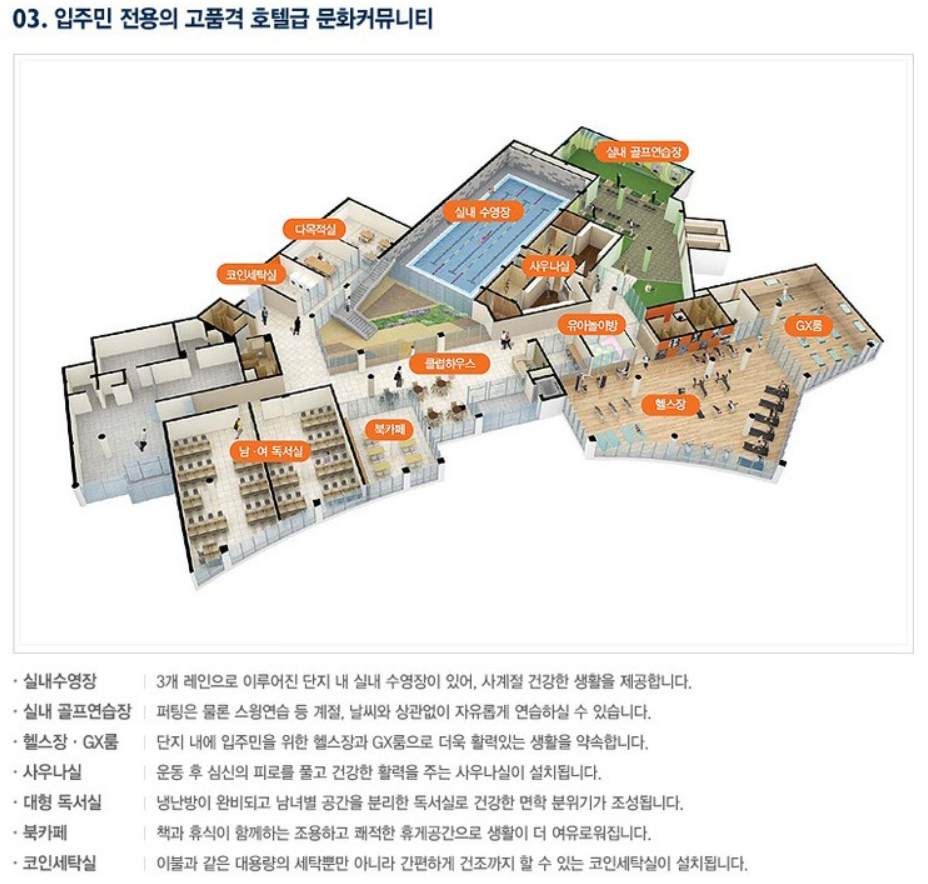 하늘도시 아파트에서 같은 건설사에서 지은 25평형대 우미린 1단지에 이어 유일한 수영장을 가지고 있으며 이 밖에 게스트하우스,최상층에 있는 입주민 카페테리아, 실내 골프연습장, 헬스장, 독서실, 사우나, 다목적 실, 코인세탁실, 등의 커뮤시티 시설을 갖추고 있으며 조경으로도 입소문이 나 조경, 커뮤니티 측면에서 하늘도시에서 손꼽히는 아파트로 유명합니다.