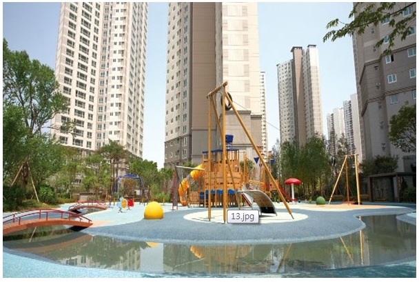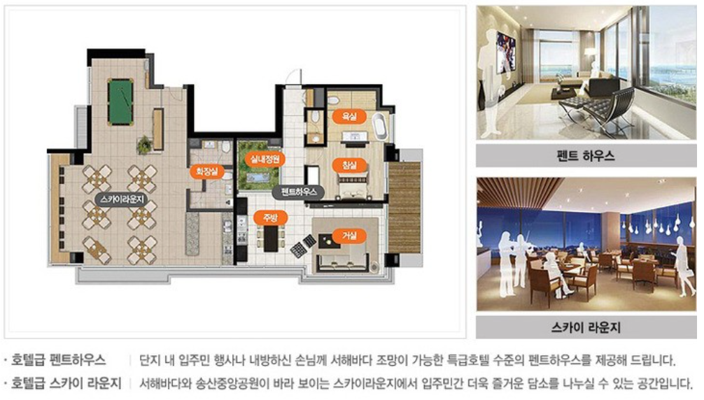 단위세대 구성에 있어 거실 기준 1층의 천정고 2m60 , 최상층 천정고 3 m50 , 기준층 기준 2m 40으로 기준층 기준으로 하늘도시에서 한양수자인과 함께 유일하게 타 단지보다 10cm 높은 2m 40의 높은 천정고를 가져 개방감이 뛰어납니다.