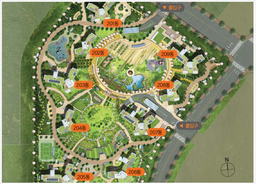 아래 단지배치도에서 200번대 동표기는 입주 시 하늘도시 단지별 동호수 부여 규칙에 따라 750번대로 변경되었습니다.