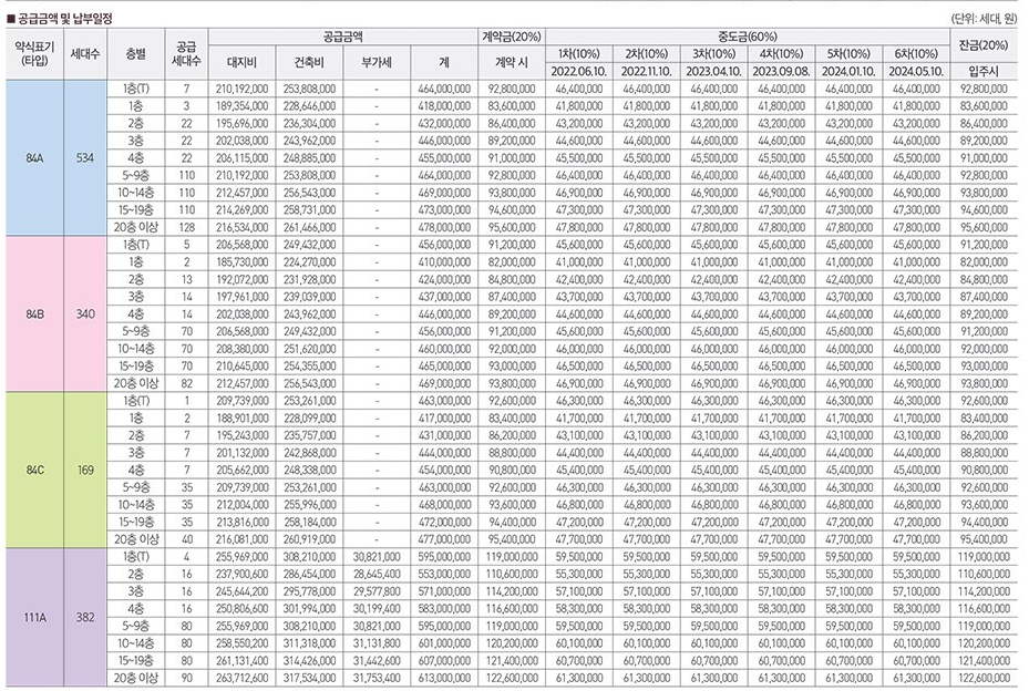 일단 계약금을 보면 계약금이 20%입니다. 아파트 분양이 잘되면 건설사들이 원활한 자금회전을 위해 초기 계약금을 20%로 책정하는데 예전에 미분양 많을 때는 5%였는데 여러모로 아파트 사기 힘든 시기가 된 것 같습니다. 계약금이 20%라면 청약 후 당첨되면 죽었다 깨어나도 계약할 때 전체 분양가의 20% 즉 84A 20층 이상 기준 9천5백60만 원이 필요합니다. 즉 현재 현금성 자산이 9천5백60만 원을 갖고 있어야 청약을 할 수 있다는 이야기입니다. 이를 계산하지 않고 무턱대고 청약하여 당첨되면 통장은 다시는 못쓰고 다시 청약통장을 만들면 재당첨 금지기간에 걸려 몇 년 이상 1순위 청약이 불가하게 됩니다.