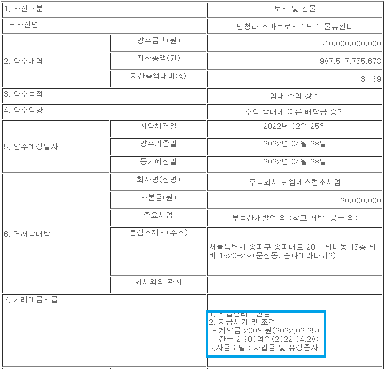 코람코에너지리츠는 2022.02.28일 아래와 같이 남청라물류센터를 3100억 원에 양수하여 편입자산에 추가한다고 공시를 하였습니다.