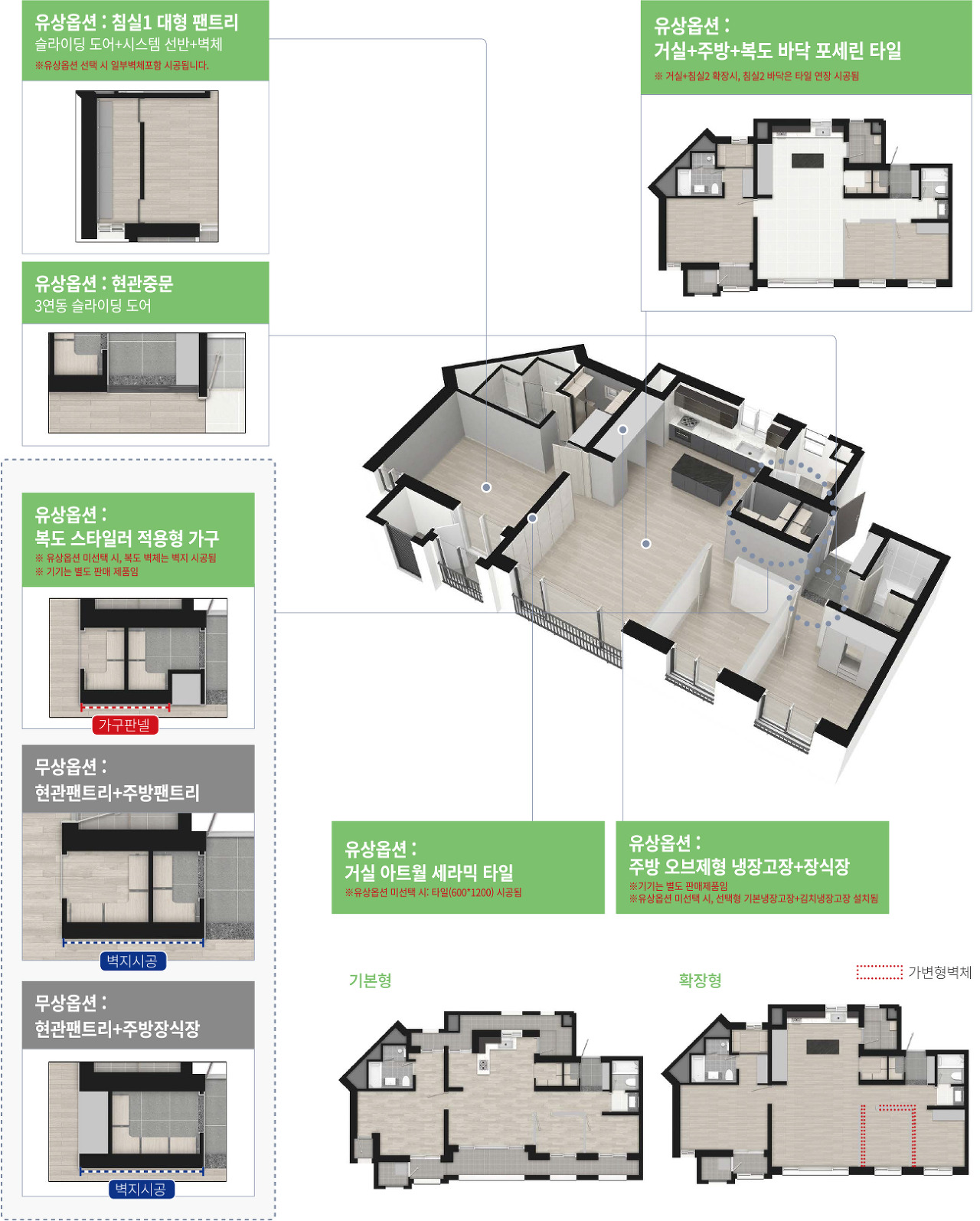 - 4 Bay 평면에서 거실 및 침실 2, 침실 3 벽체를 가변벽체로 적용하여 광폭거실, 광폭 침실 등원하는 스타일로 공간을 선택할 수 있어 공간 활용성이 높습니다. 호반 건설은 최근 모든 분양현장에서 가변형 벽체 구조를 적극 사용하고 있습니다.