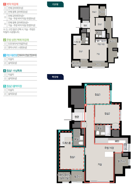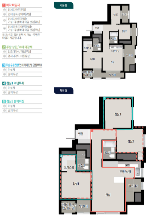- 최근 타 단지 분양 사례에서는 4 Bay 평면에서 거실 및 침실 2, 침실 3 벽체를 가변벽체로 적용하여 원하는 스타일로 선택할 수 있어 공간 활용성이 높이는 경우가 많은데 이번 현장에서는 가변 벽체를 적용하지 않은 것으로 보입니다.