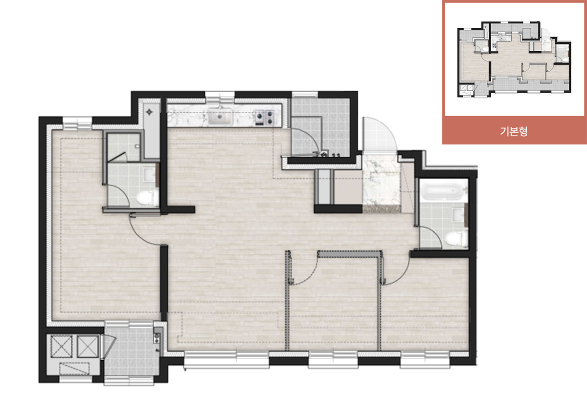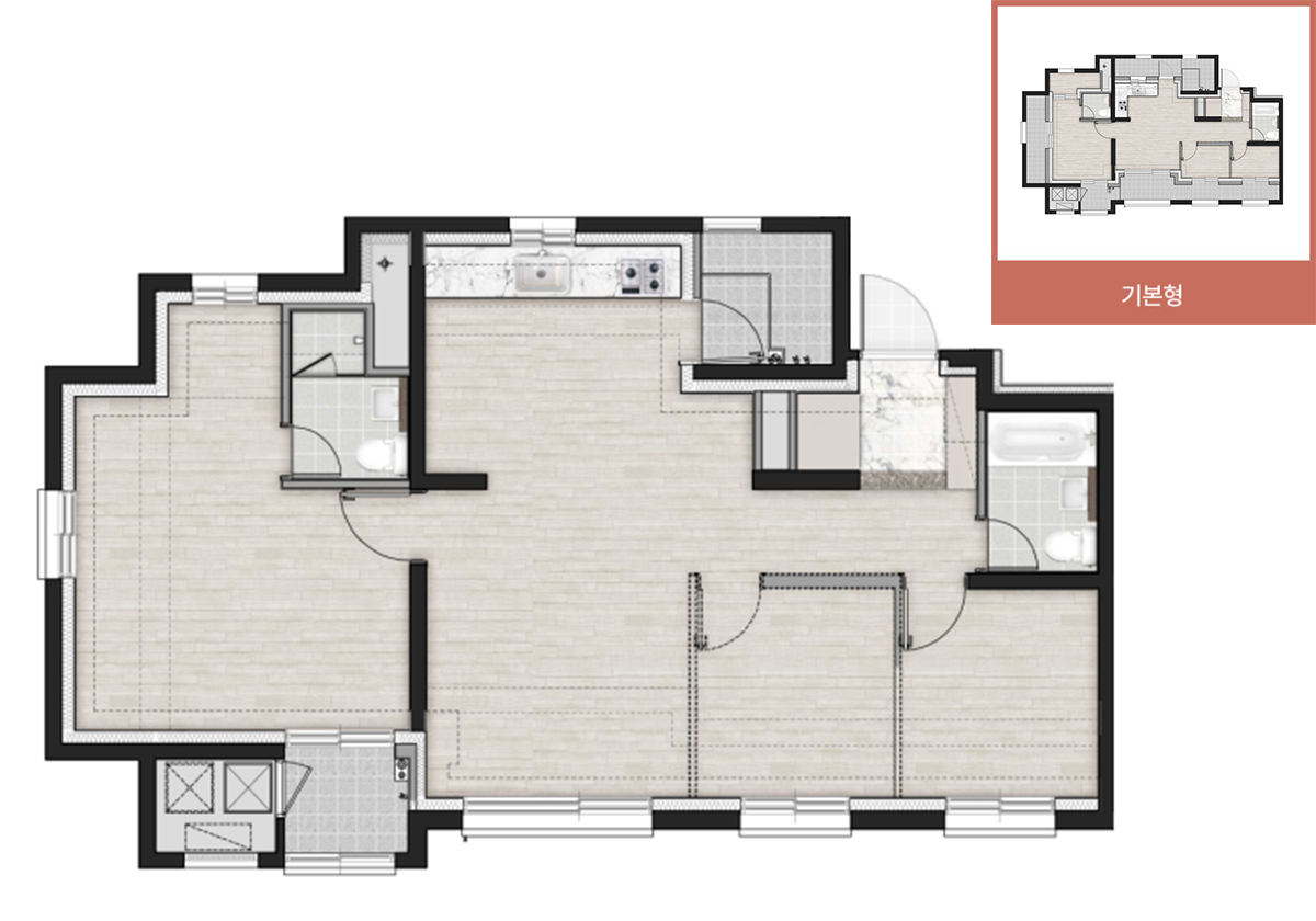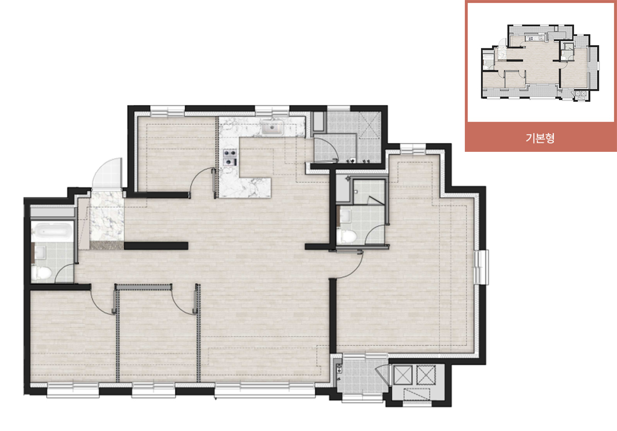 - 4 Bay 평면에서 거실 및 침실 2, 침실 3 벽체를 가변벽체로 적용하여 원하는 스타일로 선택할 수 있어 공간 활용성이 높습니다.