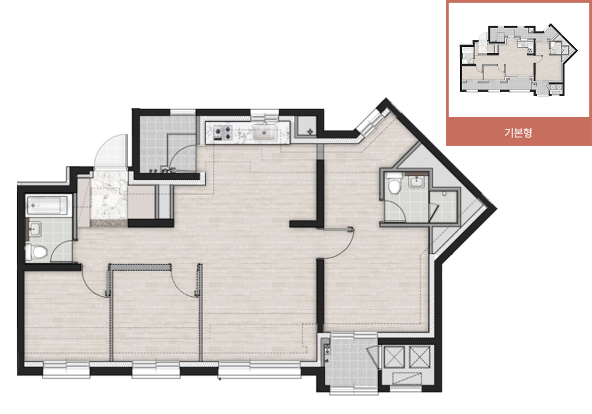 59A와 모두 동일한데 안방 후면 발코니 구조가 사선으로 되면서 약간 변형된 구조입니다. 덕분에 59A와 달리 부부욕실 공간이 발코니를 침범하지 않아 딱 그 정도 크기만큼의 드레스룸 여유공간이 생겼습니다. 나머지는 59A와 모두 동일한 구조로 보입니다.