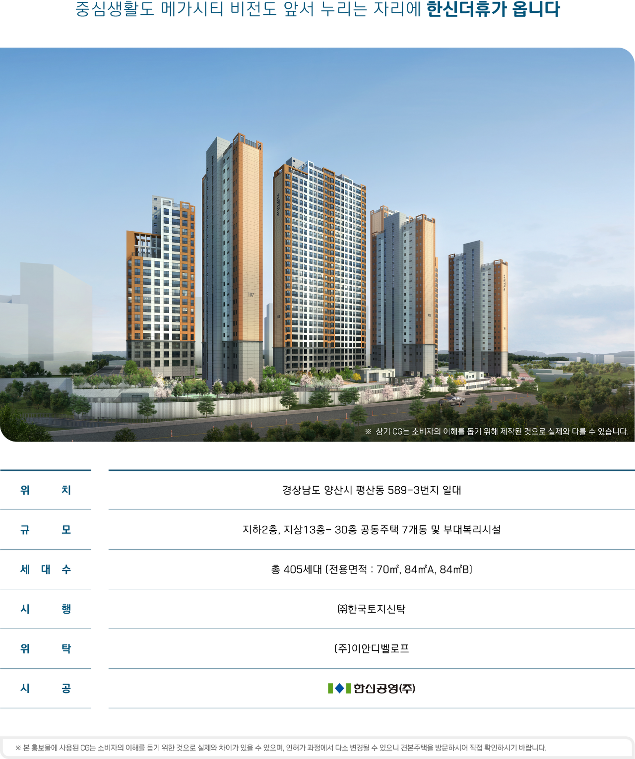 양산 한신더휴 아파트는 경산남도 양산시 평산동에 들어서며 지하 2층 지상 13~30 층, 총 7개 동의 전용면적 84m2 이하 중소형 세대로 구성된 총 405세대 소형 단지입니다.