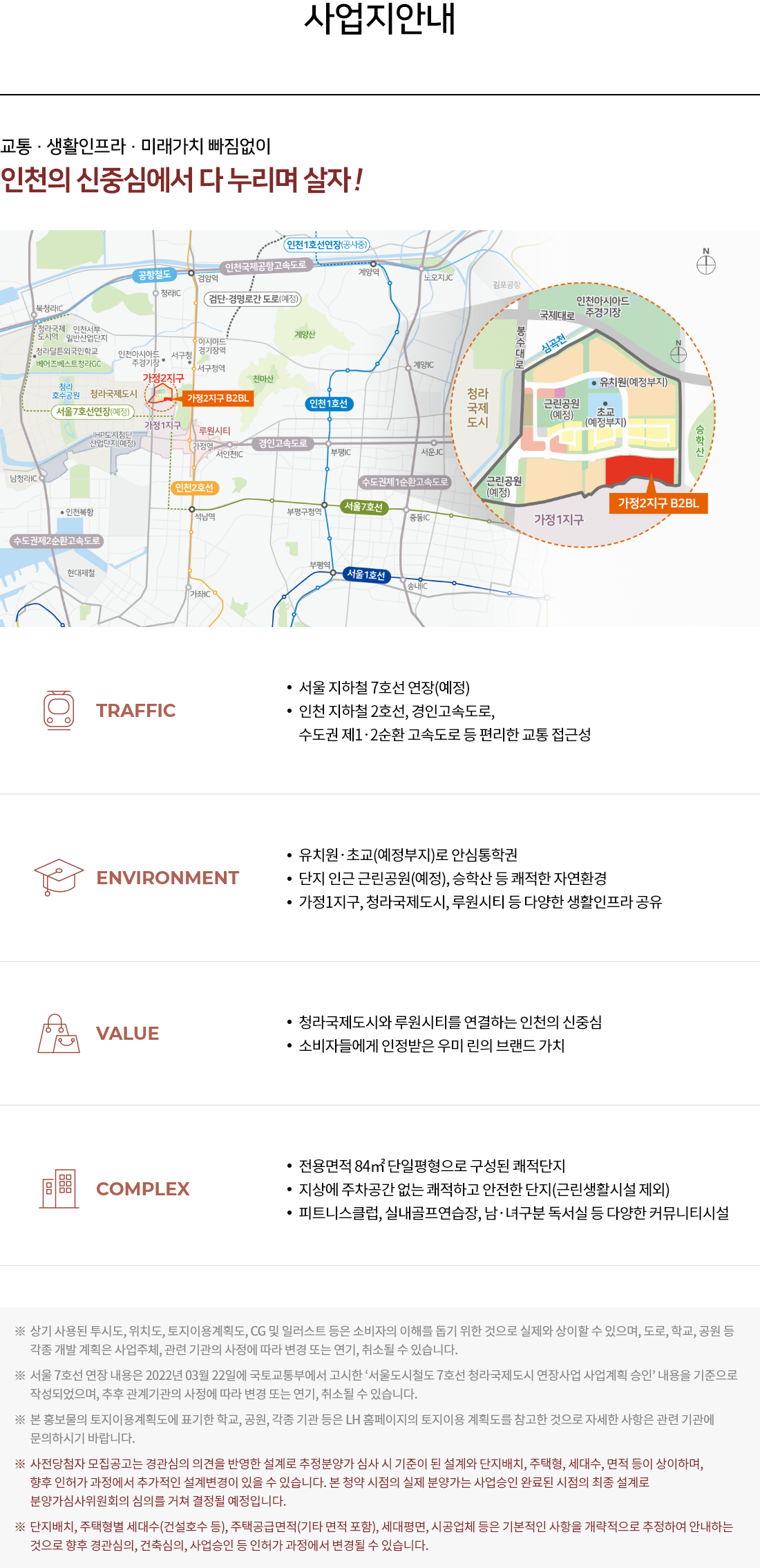 가정 2지구는 인접한 가정1지구, 청라국제도시 및 루원시티와 함께 대단위 주거단지를 이루고 있으며 이미 조성된 다양한 생활 인프라를 그대로 이용 가능한 지역으로 생활이 편리하며 인천 지하철 2호선, 서울 지하철 7호선 연장역 , 경인 고속도로 가정 IC 인근으로 교통 또한 편리합니다. 단지 북쪽에 유치원 및 초등학교 예정부지가 있어 자녀들의 도보 통학가 가능하며 승학산을 끼고 있어 쾌적한 환경이 될 것으로 보입니다.