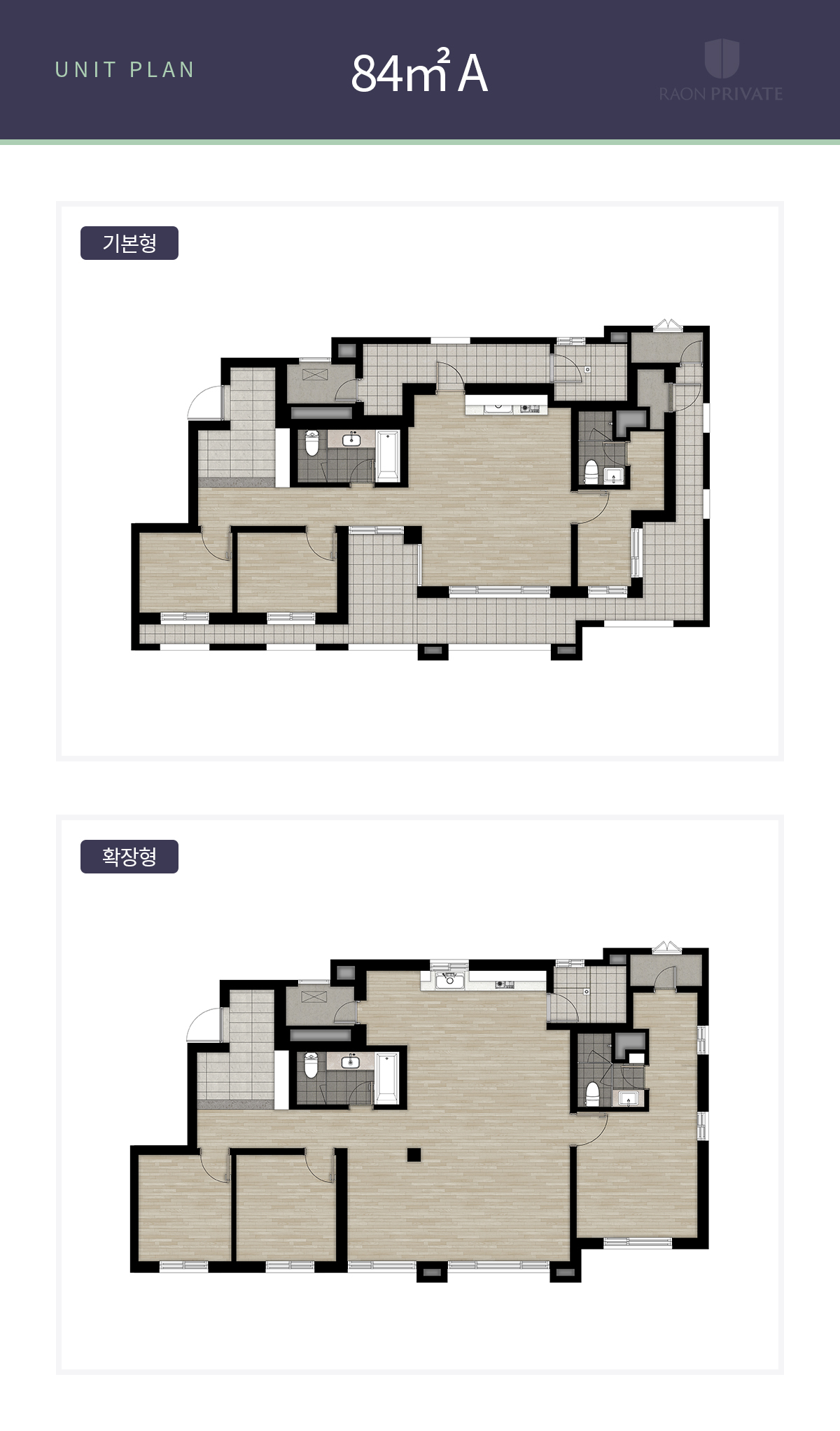 현관은 공간은 크지만 한쪽 신발장만 제공되며 아마도 옵션을 통해 현관 발코니 쪽으로 팬트리 창고가 생기고 거기에 이어져 복도 쪽에 복도 팬트리가 제공될 것으로 보입니다. 이렇게 되면 수납공간으로 보면 아주 넉넉한 공간입니다. 부부욕실, 다용도실, 공용욕실의 구조는 84A와 모두 같습니다. 주방 옆 팬트리공간 까지 하면 수납은 제일 좋을 것으로 보입니다.