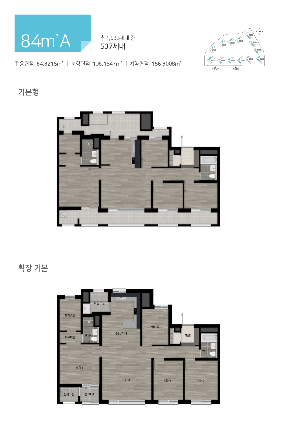 3면 발코니 확장을 적용했음에도 같은 타워형인 84B Type과 각 공간의 비례를 비교해 볼 때 드라마틱하게 공간이 커진 것으로 체감이 되지 않습니다. 발코니 영역에 전용면적이 일부 반영되어 있었던 것으로 보입니다.