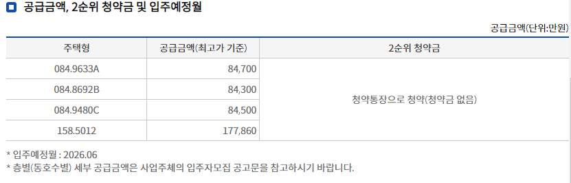공사기간이 길어 중도금 후불이자가 상당할 것으로 보이며 입주시 취득세, 중도금 후불제 이자 등으로 분양가와 별도로 추가적으로 약 5000만 원 이상이 추가 필요하리라 보입니다. 입주예정일이 2026년 6월로 계획되어 있어 입주까지 시간이 넉넉한 편으로 자금 마련 일정에는 조금의 여유가 있겠습니다.