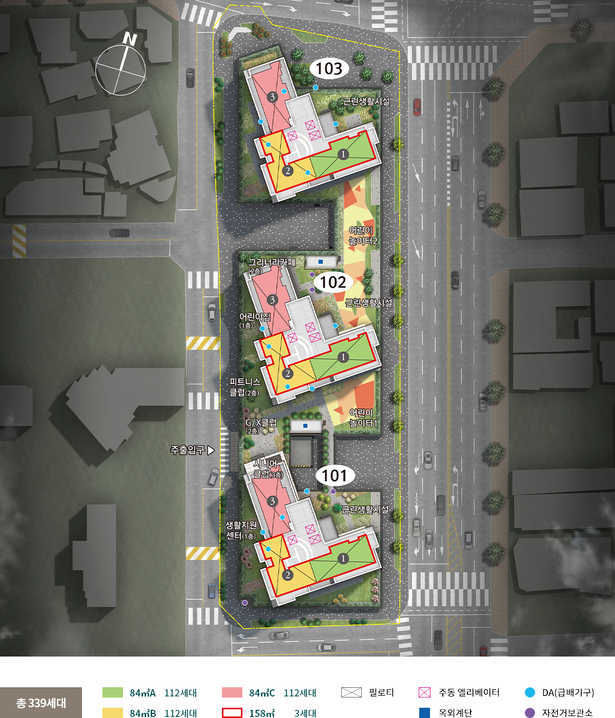1층 부터 3층까지는 상업시설이 들어오므로 실제 아파트는 4층부터 들어옵니다. 단지는 세 개의 동이 일렬로 배치된 형태로 84A, B Type은 남향에 가까운 남동향, 84C Type은 서향에 가까운 서남향이 될 것으로 보입니다. 주상 복합으로 층수가 높고 동 간 거리가 넉넉하지 않아 일부 중 저층 세대는 해의 방향이나 타동 간섭에 따라 채광이 부족할 수도 있겠습니다.