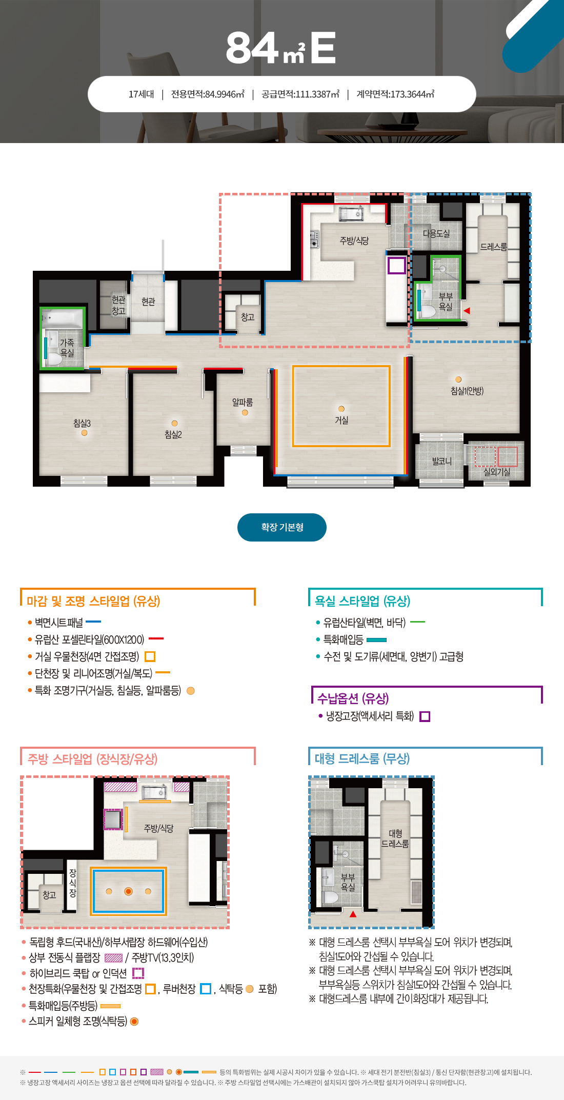 안방 드레스룸 공간 역시 넉넉한 공간을 제공하고 부부욕실 또한 세면대가 따로 독립한 구조입니다. 거실 역시 2면 개방형으로 폭과 길이가 평형에 맞게 늘어난 것으로 보이며 주방 공간 역시 넉넉해졌습니다. 다용도실 위치가 84D와 달리 거실/주방 측면에 위치하지 않고 주방 뒤로 위치가 이동하였습니다. 전체적으로 길이가 길어진 셈인데 이 때문에 복도 공간에 제법 넉넉한 크기의 복도 팬트리 수납공간을 더 제공할 수 있고 주방 식탁 위치의 깊이도 깊어졌습니다.