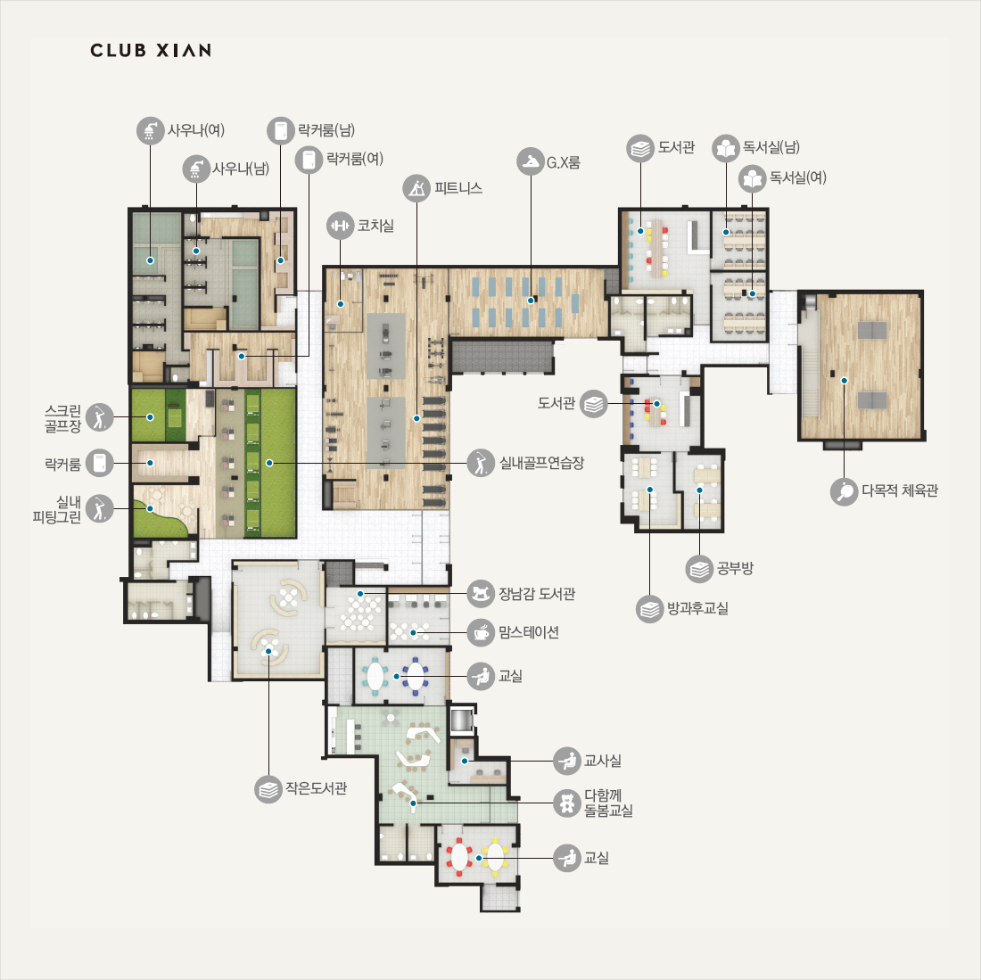 공공분양이지만 자이의 이름을 달고 나오는 민간참여 분양으로 자이답게 이름값을 합니다. 일반적인 피트니스 클럽, GX룸, 골프연습장, 남녀 독서실 등 외에도 다목적 체육관, 도서관, 공부방, 방과 후 교실, 장남 간 도서관, 돌봄 교실 등 다양한 커뮤니티 시설을 추가로 제공합니다.
