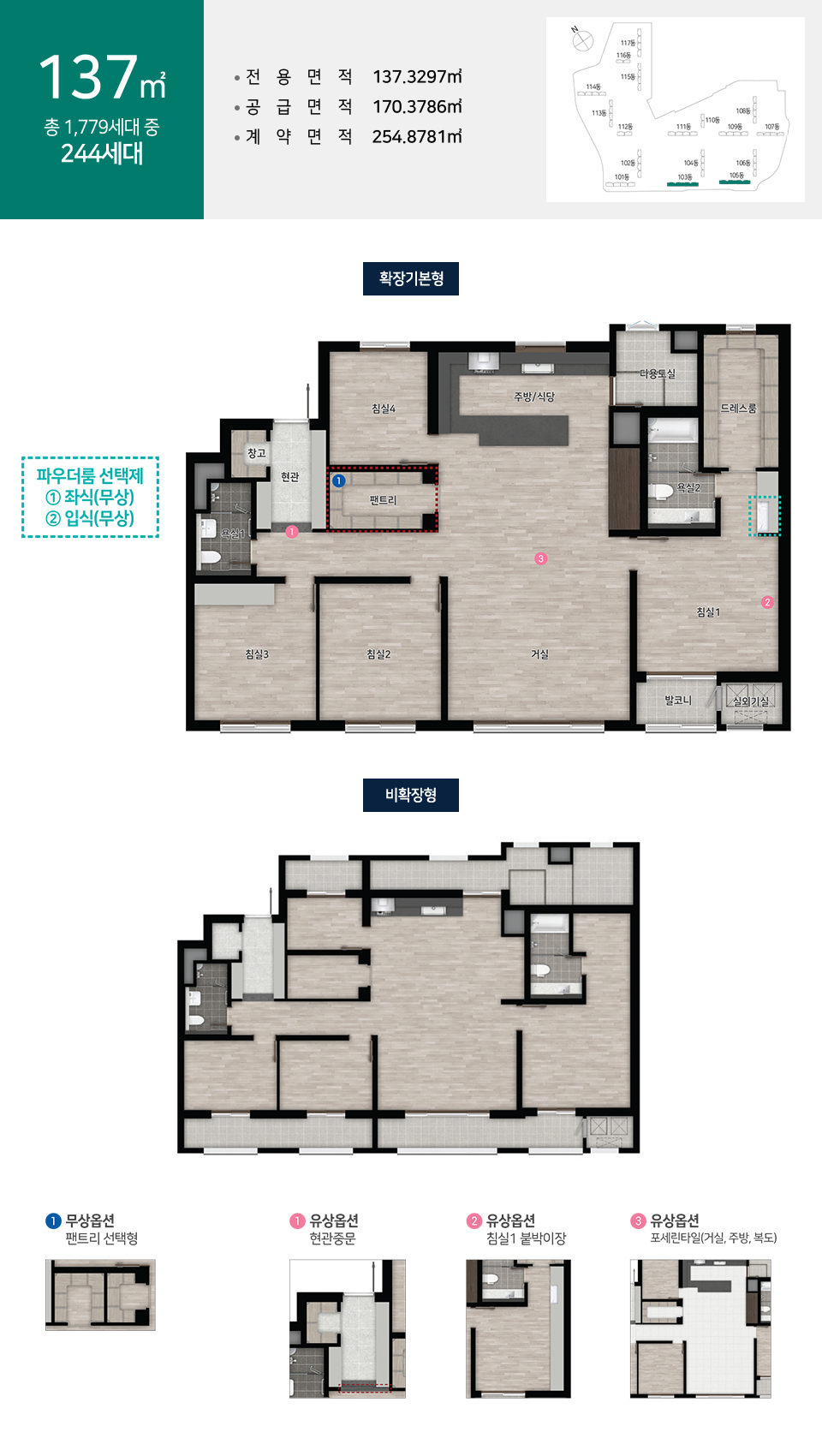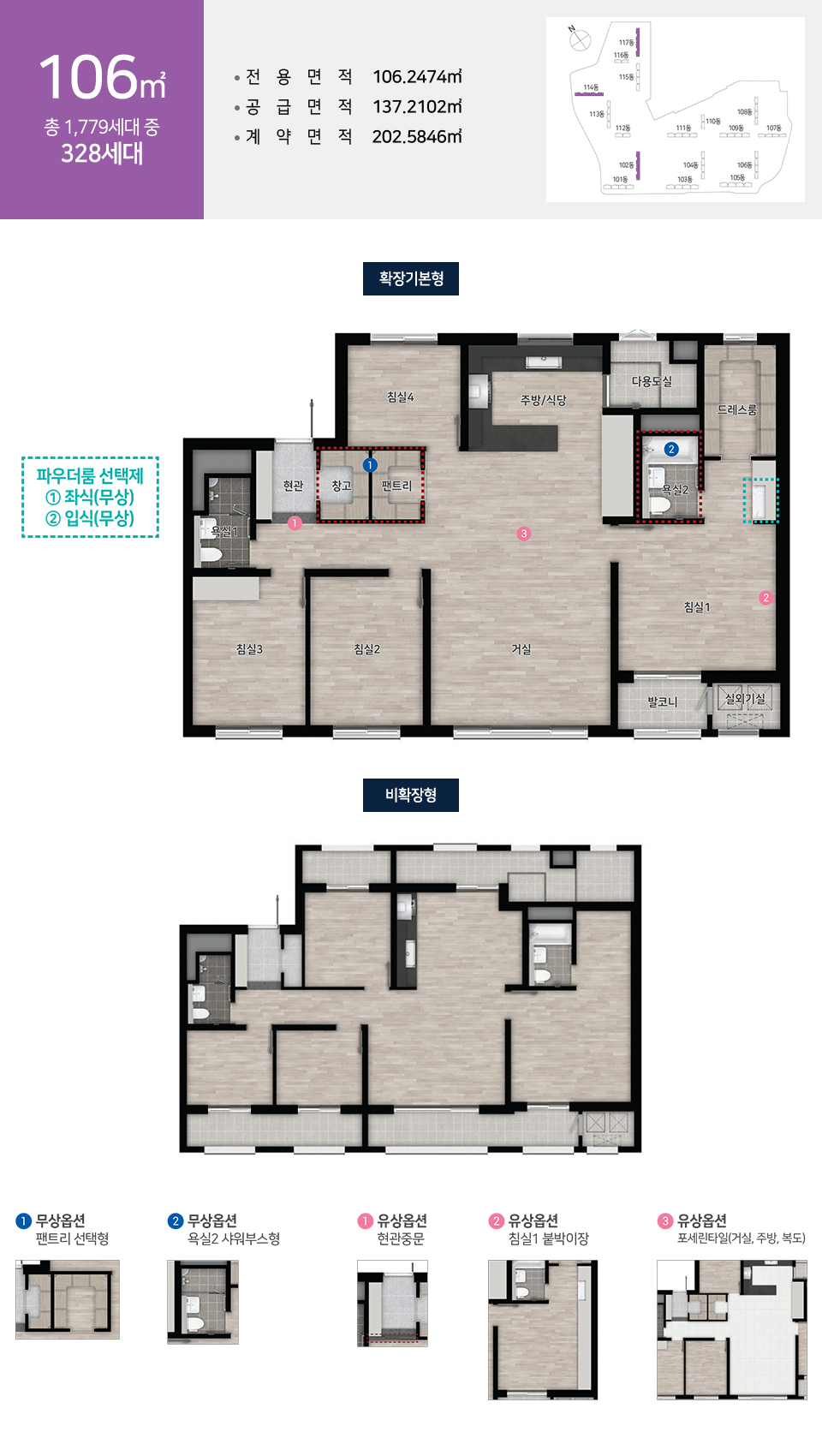 전체적으로 84 Type,106 Type과 구조는 동일하면서 평형대가 커지면서 사이즈에 비례하여 모든 공간이 더욱 넉넉해졌습니다.