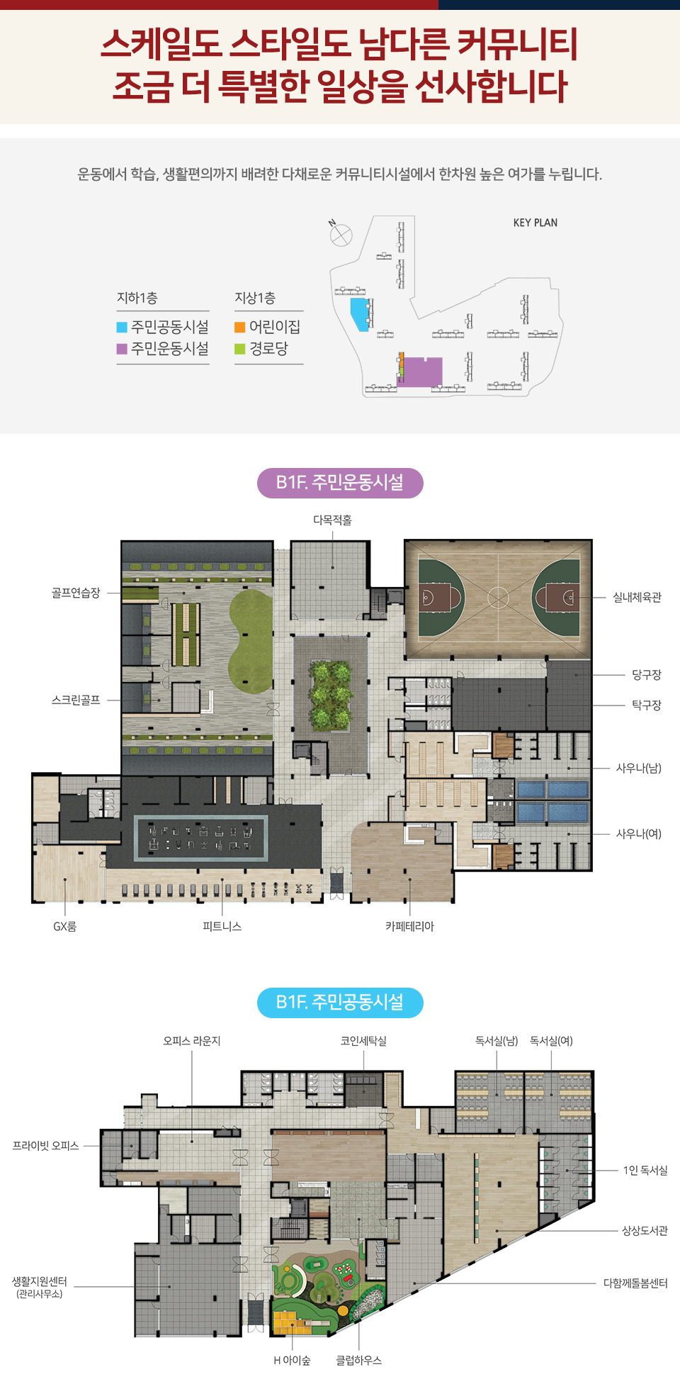 대단지답게 피트니스센터, 실내골프연습장, 작은 도서관, 독서실 등 일반적인 커뮤니티 시설 외에도 다목적 실내체육관, 당구장, 탁구장, 스크린 골프연습장, 사우나, 카페테리아, 프라이빗 오피스, 코인 세탁실 등 다양한 커뮤니티 시설을 추가로 제공합니다.