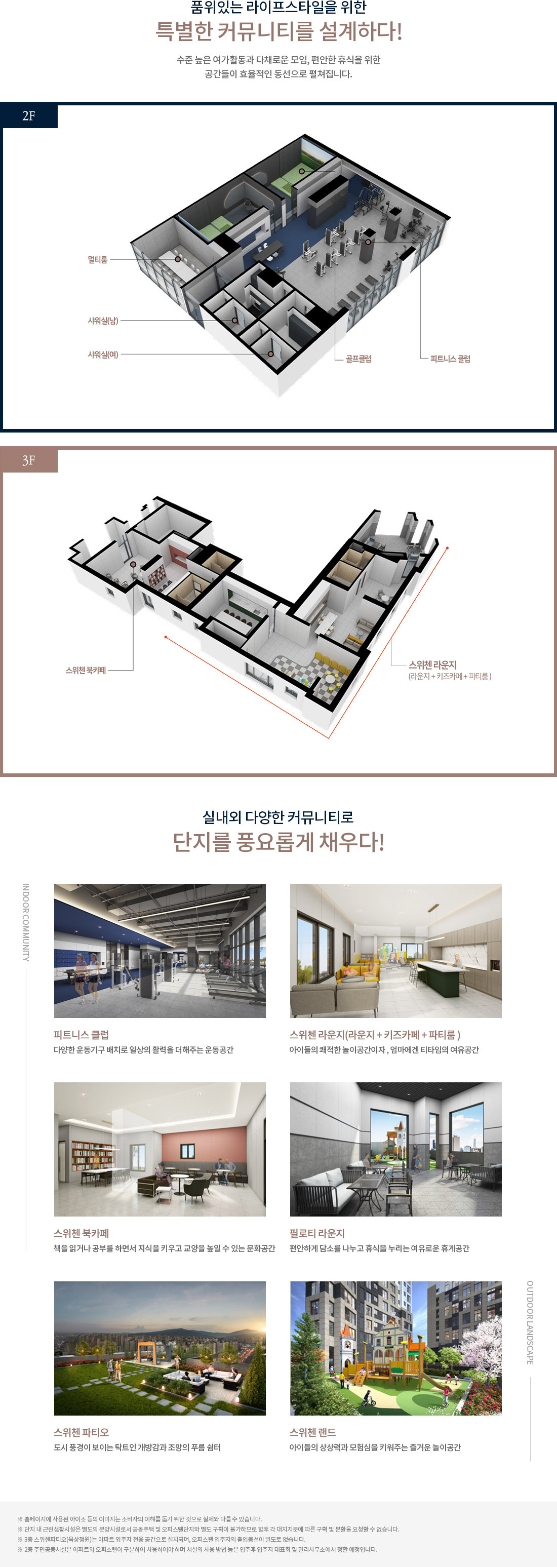 세대수가 많지 않은 관계로 피트니스클럽, 북까페 등 일반적인 커뮤니티 시설을 제공합니다.