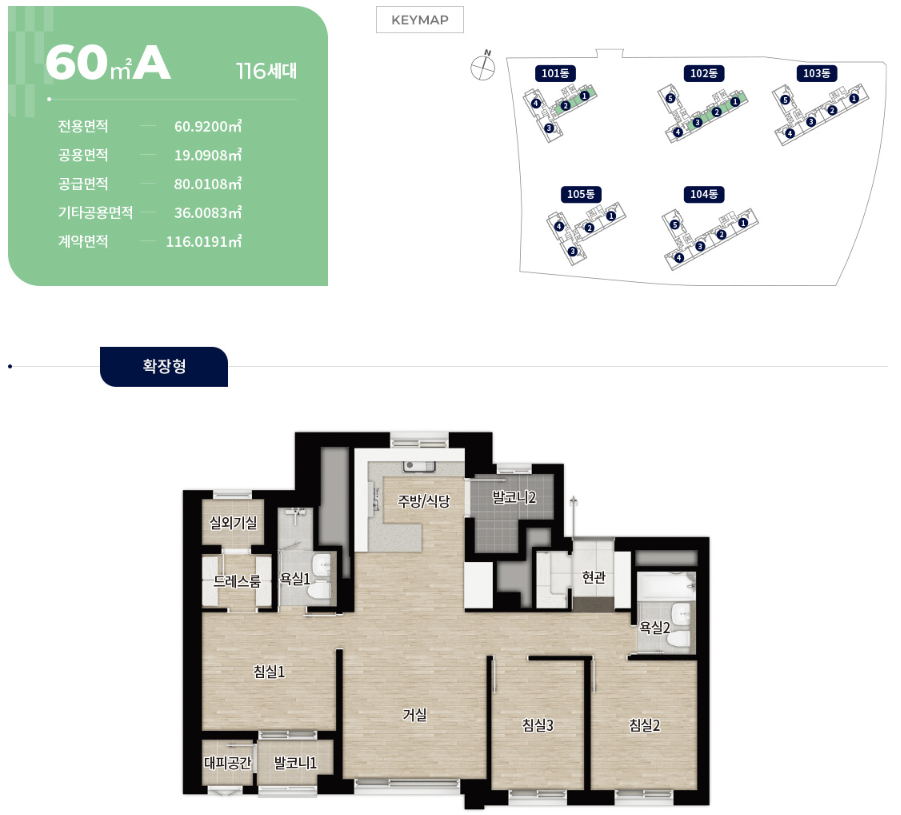 60A Type에서 침실 하나를 줄이고 대신 주방을 비롯하여 전체적인 공간을 키웠습니다. 방의 개수가 중요하지 않다면 많이 들 선호할 구조로 보입니다.