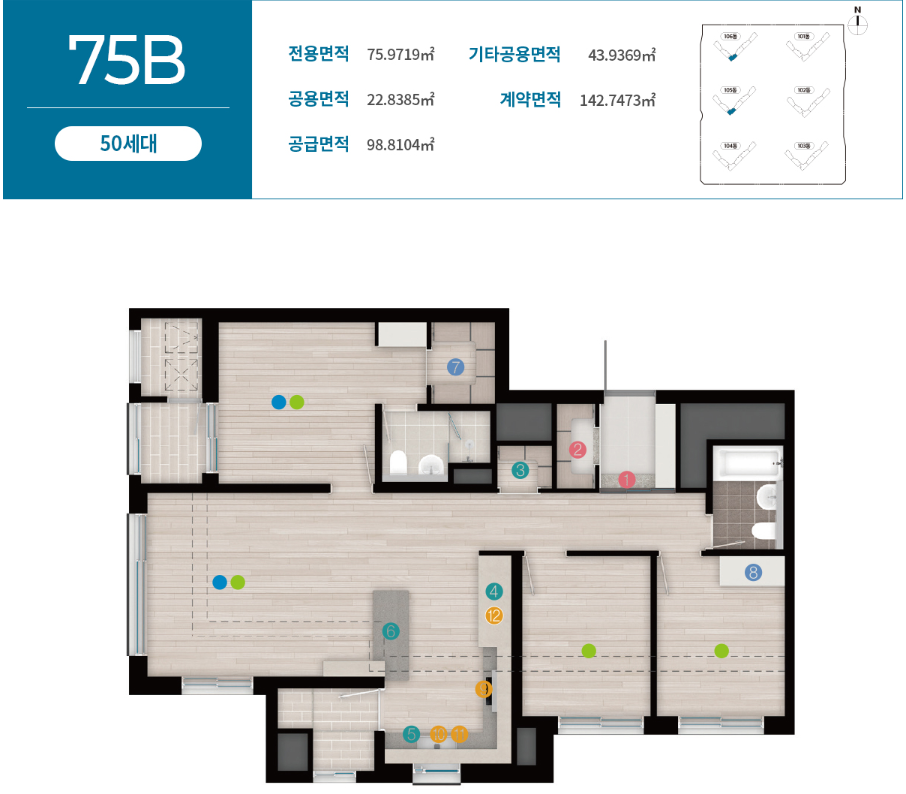 전형적인 타워형 구조입니다. 거실이 2면 개방형입니다. 개방감과 환기, 채광 측면에서 좋겠습니다. 안방 드레스룸은 타워형인 것을 감안하면 무난합니다. 타워형은 안방 후면 공간 확보가 어려워 특화 설계를 하지 않는 한 드레스룸 공간이 작습니다. 특화 설계가 들어가지 않은 부분은 아쉽습니다. 부부욕실은 무난하며 안방 발코니 또한 75A Type과 같습니다.