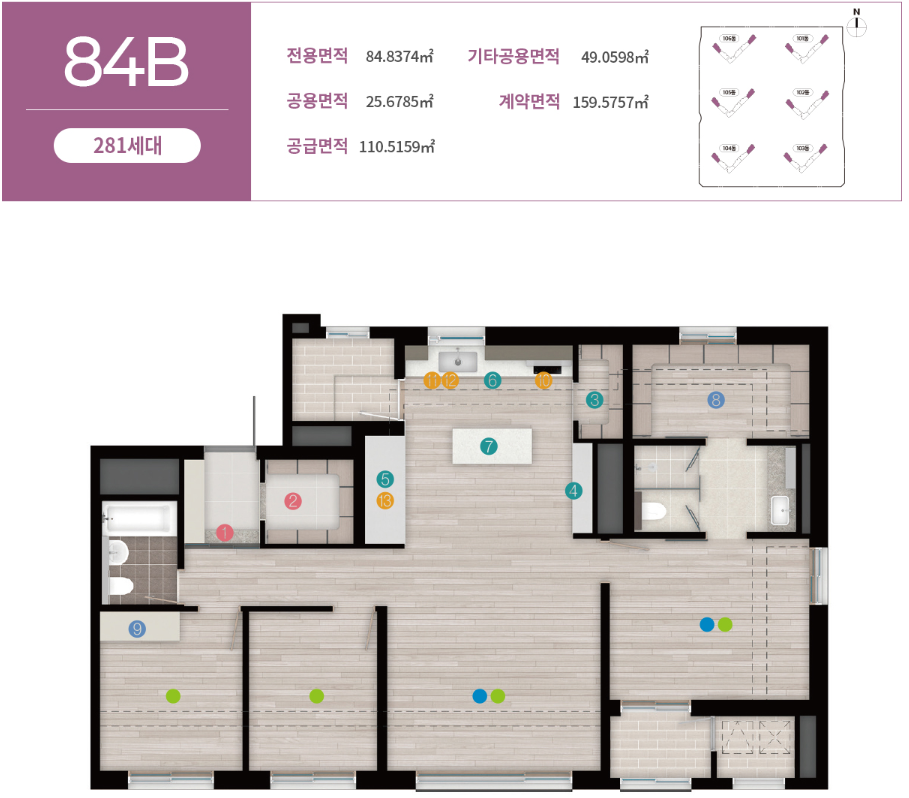 3면 발코니 확장을 적용해서 84A Type과 동일한 구조를 만들어 냈습니다. 치수를 제공하지 않아 확인이 어렵지만 84A Type에 비해 안방 폭/드레스룸 폭이 다소 길어 보입니다. 그 외에는 84A Type과 모두 일치합니다.