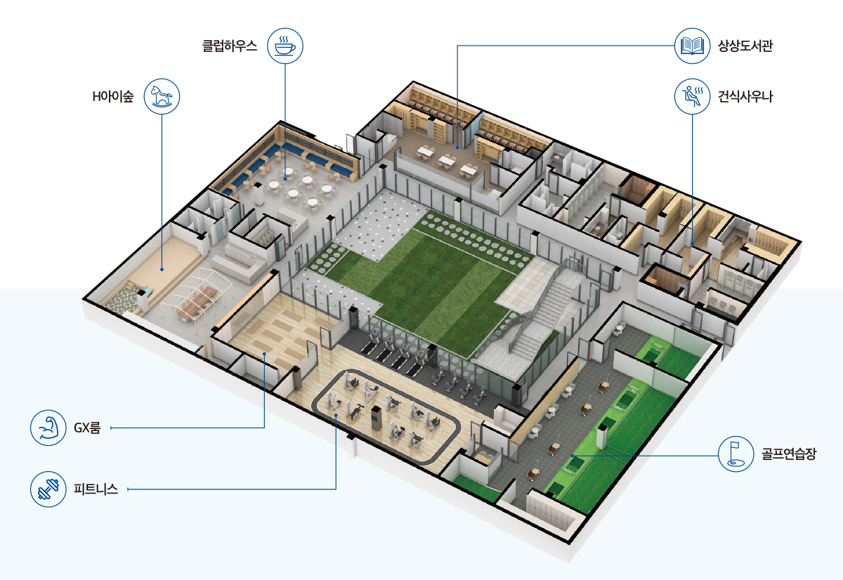 중대형 단지 답게 피트니스센터, 골프연습장 등 일반적인 커뮤니티 시설 외에 건식 사우나, 상상 도서관, 클럽하우스 등 규모에 맞는 커뮤니티 시설을 추가로 제공합니다.