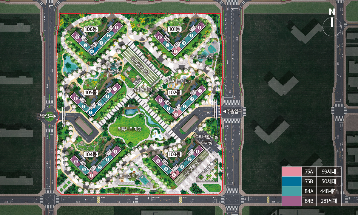 V자 모형의 동 구조로 전체 남향,남서향 배치입니다. 동 간 거리가 넉넉하고 단지 중앙에 넓은 통경축을 확보하여 조경공간을 조성하고 있습니다. 105동 전면 세대 중 저층은 중앙광장 뷰가 좋겠습니다. 다른 세대도 동 간 거리 확보로 단지 곳곳에 조경 공간이 많아 단지 조경이 잘 꾸며진다면 단지 뷰가 좋을 것으로 보입니다. 동 간 거리는 넉넉하지만 해의 방향이나 타동 간섭에 따라 일조권을 방해받는 세대가 일부 있겠습니다. 단지 밖 도로와 세대가 충분히 이격 되어 있어 소음 및 사행활 보호 측면에서도 큰 불편은 없겠습니다.