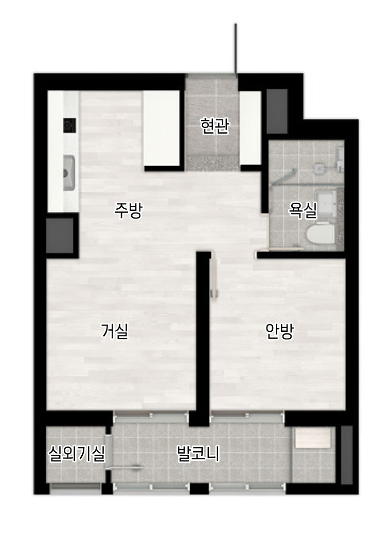 주방 은전 형적인 타워형 구조로 복도에서 다용도실 입구까지 길게 빠져 있으며 무난해 보입니다. 다용도실이 59A Type과 달리 기둥 때문에 네모 반듯하지 않고 공간의 희생이 있어 조금 아쉽습니다. 부부욕실 역시 샤워공간이 다소 희생된 점 59A와 같습니다. 현관 한쪽 신발장 , 안방 발코니 모두 59A Type과 큰 차이가 없습니다.