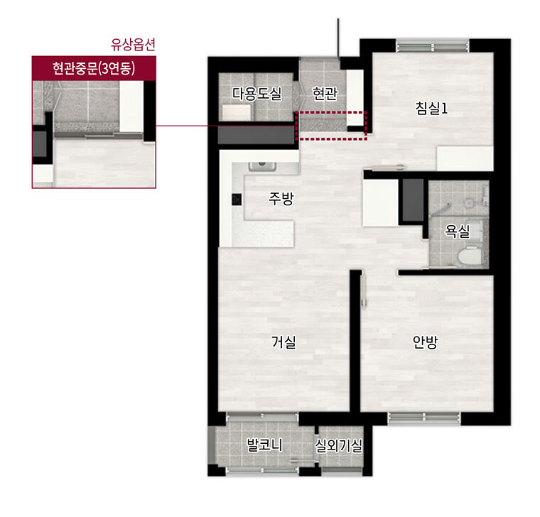 현관 또한 평형대에 맞게 공간은 넉넉해 보이나 출입문과 복도 입구의 구조로 인해 한쪽 신발장만 제공됩니다. 역시 수납 측면에서 아쉬운 부분입니다. 공용욕실 공간은 무난해 보이며 다용도실 공간도 네모 반듯하여 좋습니다.
