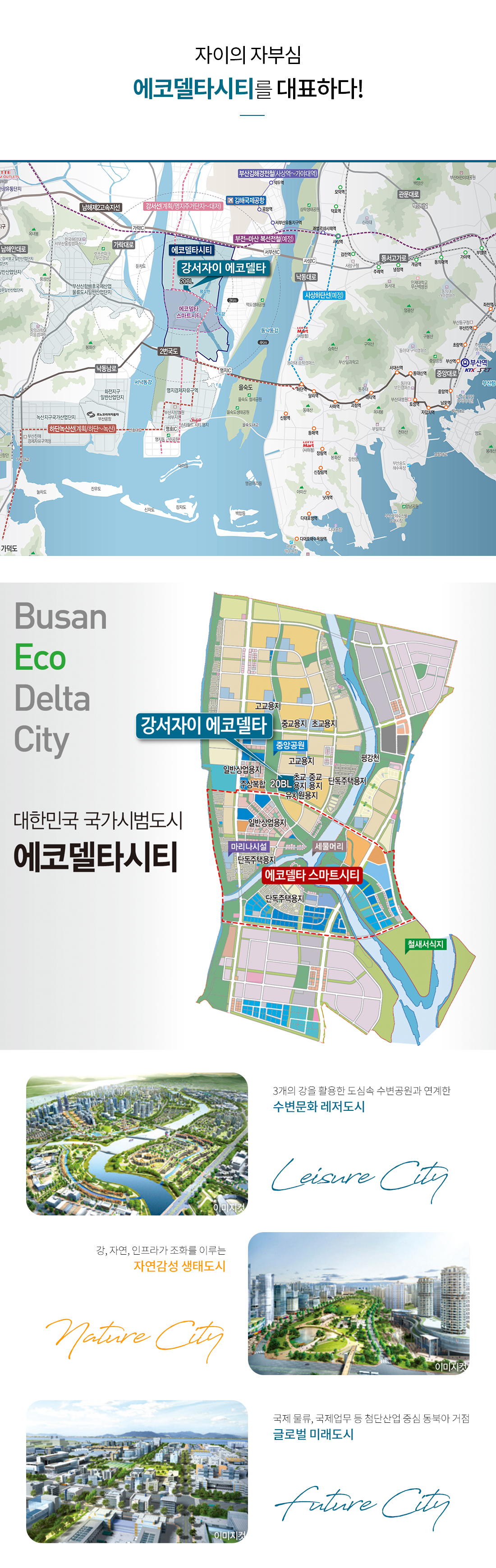 에코델타시티는 강서구 오션시티, 명지국제신도시에 이어 개발되는 ‘글로벌 혁신도시’로, ‘강서자이 에코델타’는 에코델타시티 중에서도 가장 중심인 20BL에 들어서게 됩니다. 통학 안전성이 가장 중요한 초등학교와 어린이집이 단지 인근 도보 가능한 거리에 위치하고, 부산 도시철도 3호선 대저역에서 연결되는 강서선 경전철역도 아파트 바로 앞에 들어섭니다. 상업지역이 바로 아파트 앞에 위치해 편의시설과 학원가가 형성되면 주거 편의 및 교육 관련 인프라를 충분히 누릴 수 있으며 광역 교통망도 좋아 남해고속도로 제2지선에 접해 있어 고속도로를 통해 부산 서면까지 30분, 김해 장유까지 10분, 창원은 25분가량이면 도착할 수 있고 또 김해공항(5km), 가덕 신공항(12km), 부산 신항만(12km), 부산역(15km) 등 다양한 교통수단이 모두 가까워 어디로든 편리하게 이동할 수 있습니다.