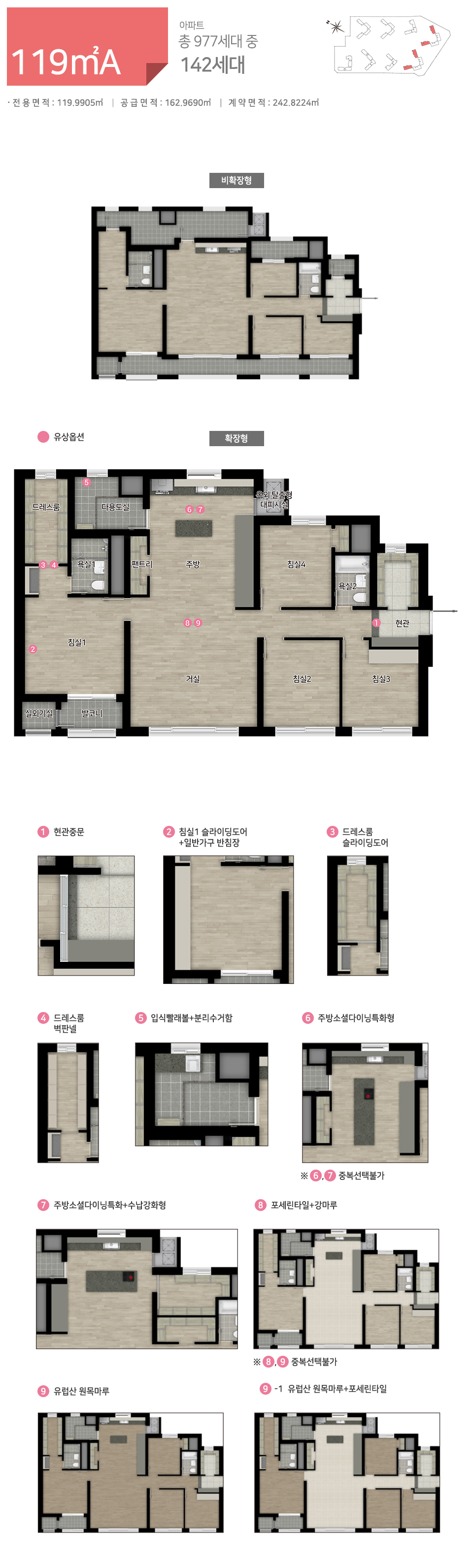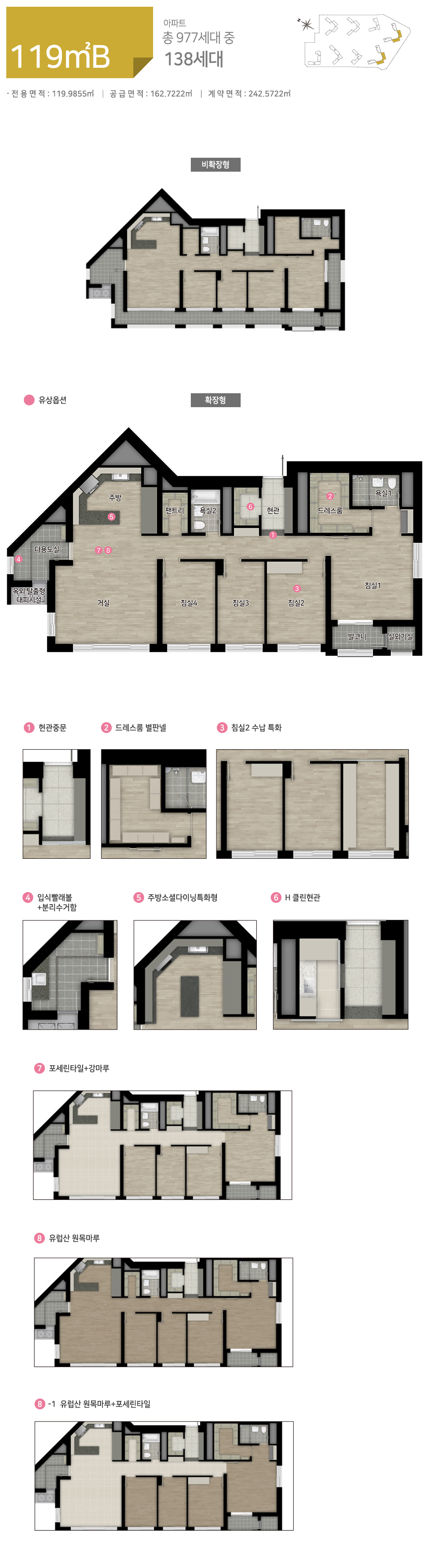 84B 구조를 평형대에 맞게 사이즈에 비례하여 크기만 키웠습니다. 덕분에 폭은 다소 작지만 방이 하나 추가되면서 5 Bay가 되었습니다. 84A에 비해 84B가 많은 단점이 있었듯이 119B도 119A에 비해 많은 단점이 보입니다. 추가로 제공되는 방은 폭이 다소 짧아 침실을 완전히 대체하기에는 어려울 것으로 보입니다.